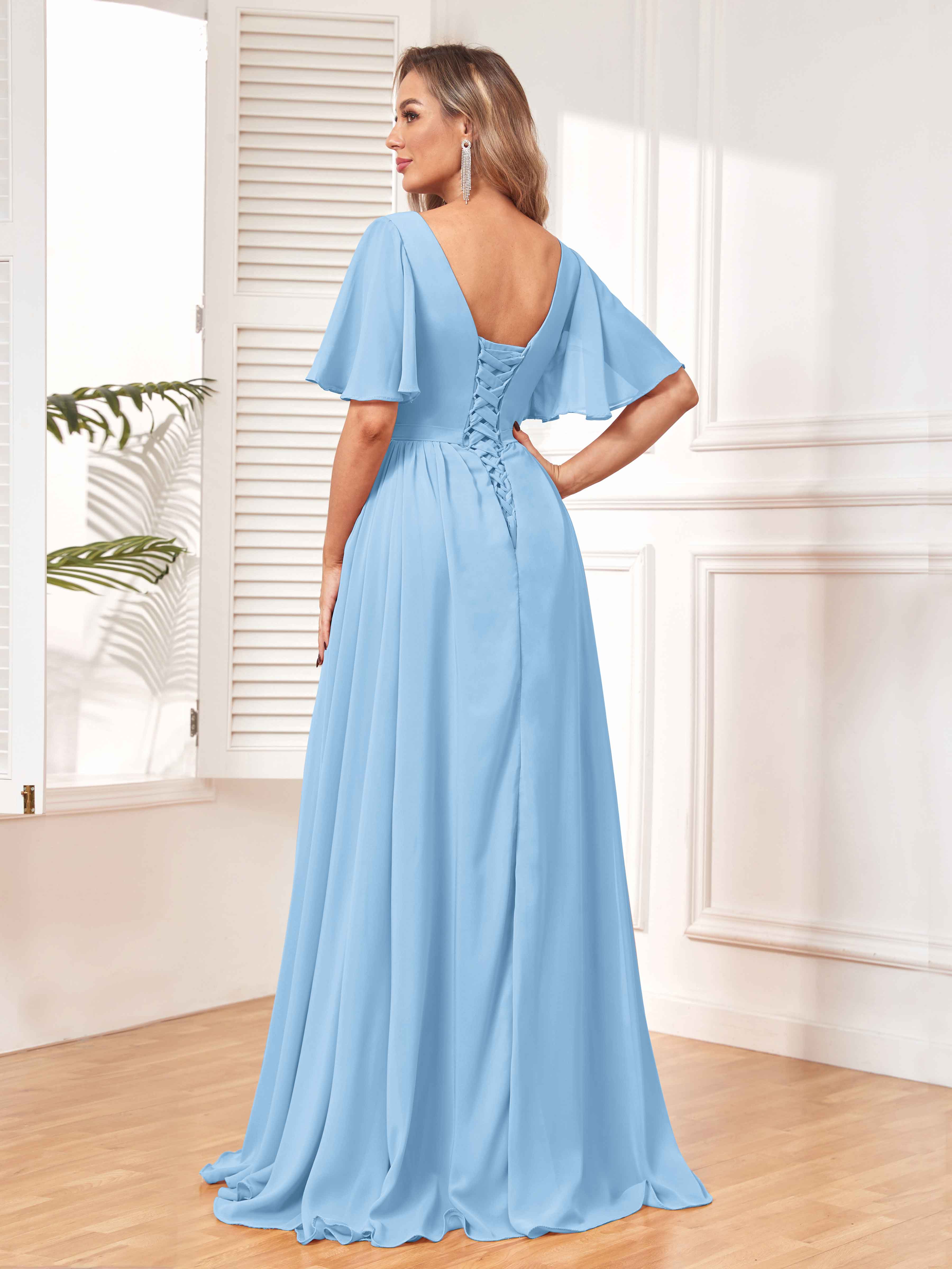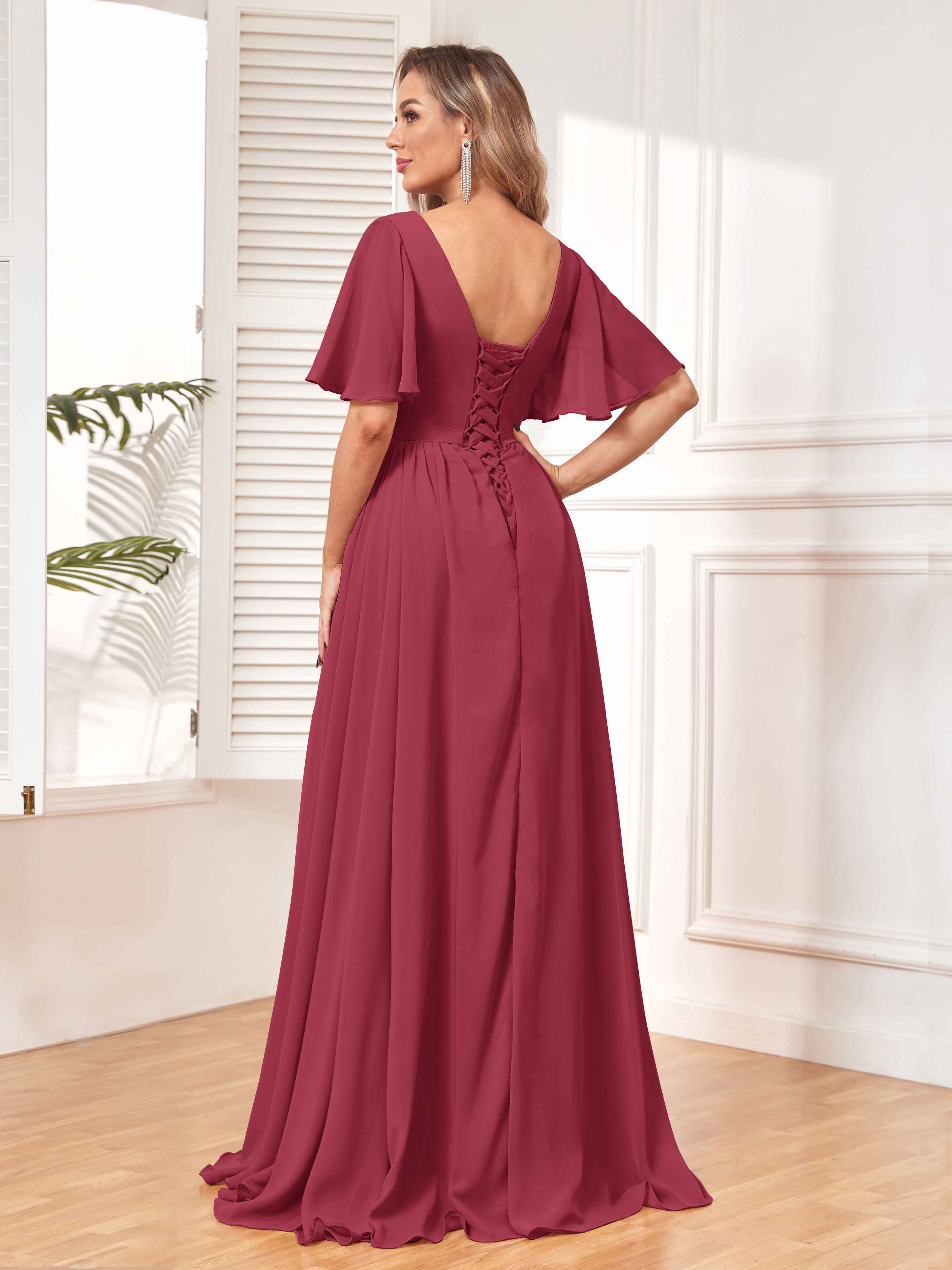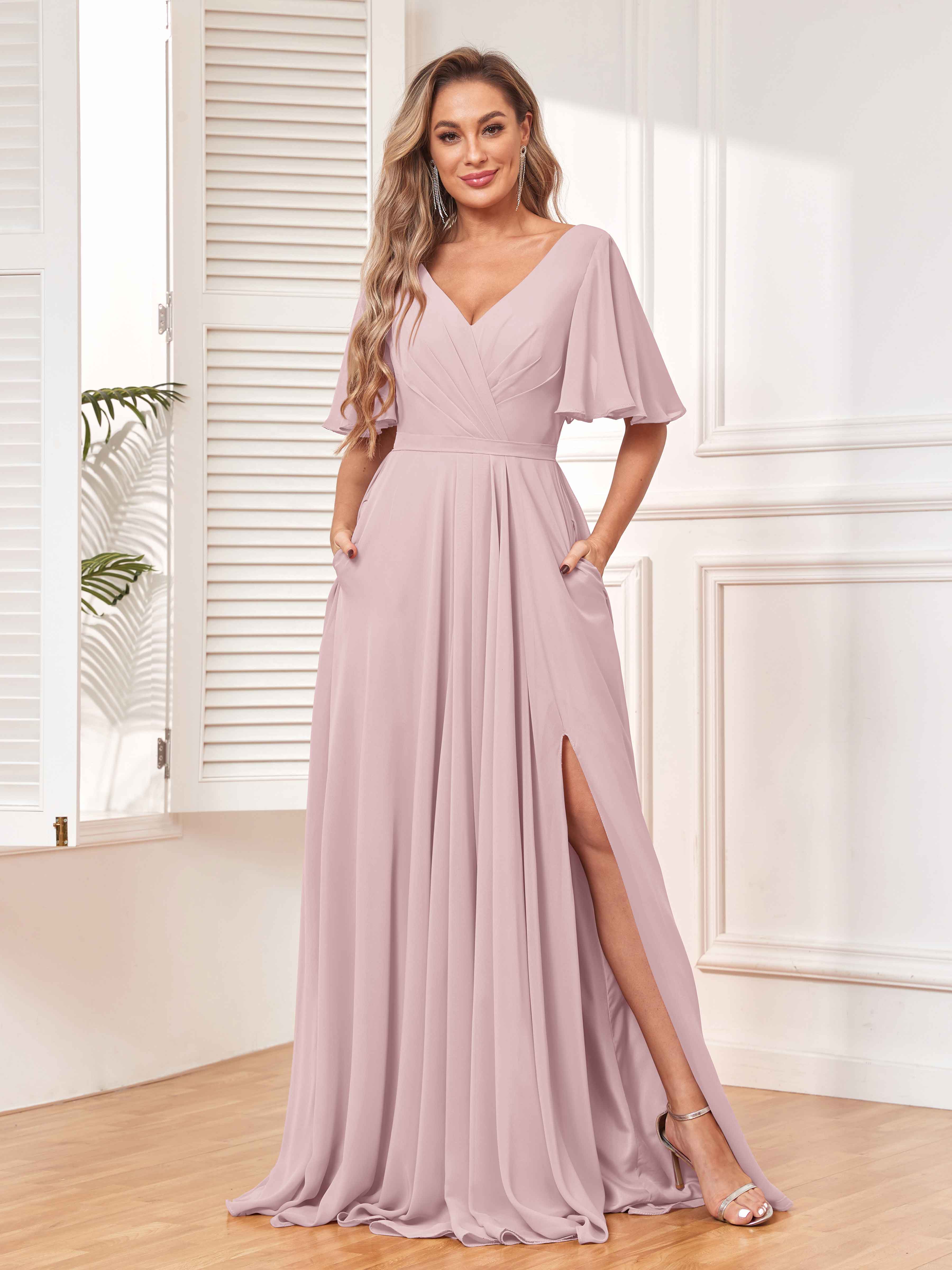 Canalisez l'élégance et le charme avec la robe de demoiselle d'honneur fendue en mousseline à manches courtes Aubrey Chic avec poches de Pomuyoo.fr. Le design à manches courtes, les fentes et les poches pratiques ajoutent une touche pratique à cette robe chic et tendance.