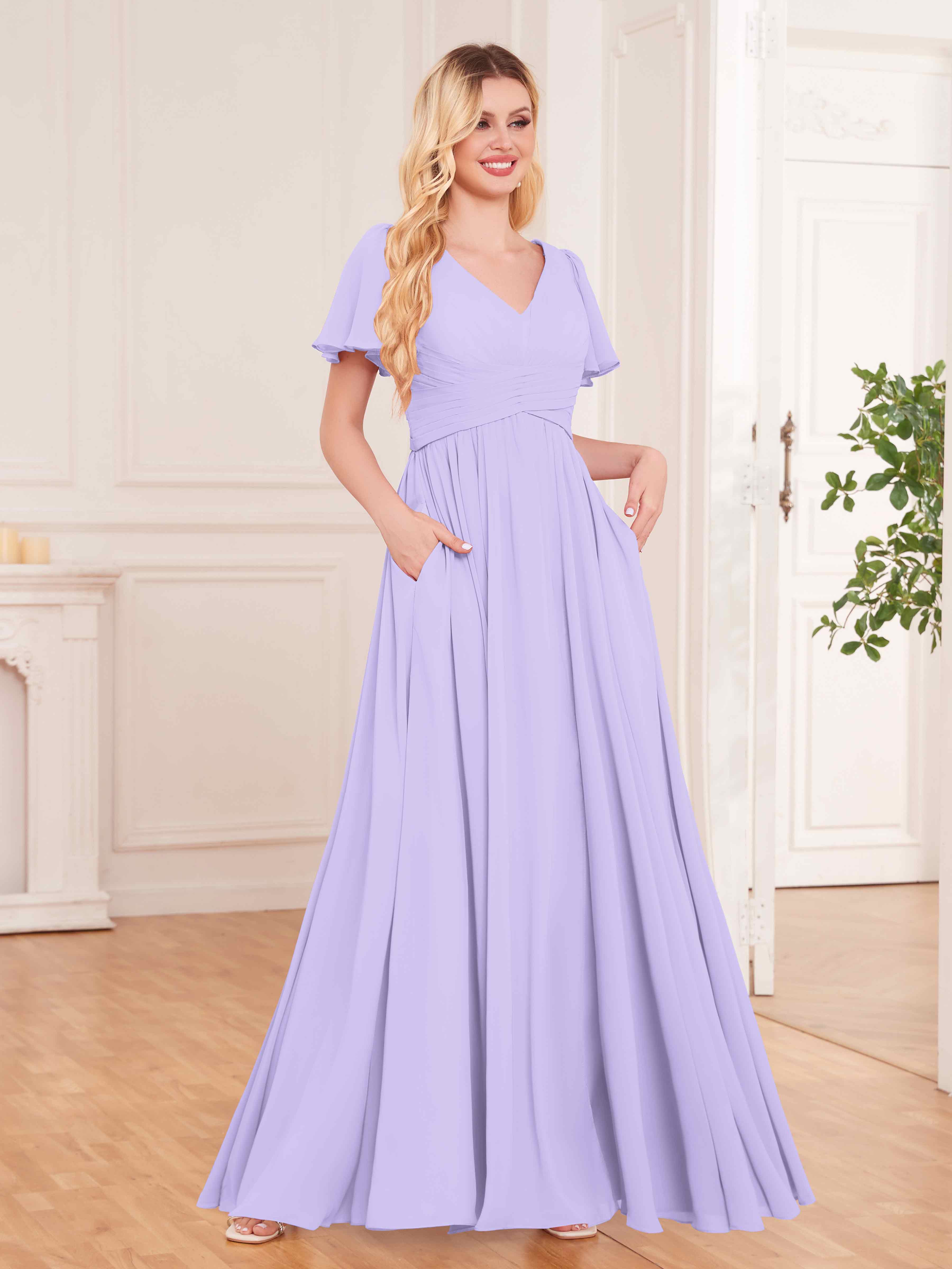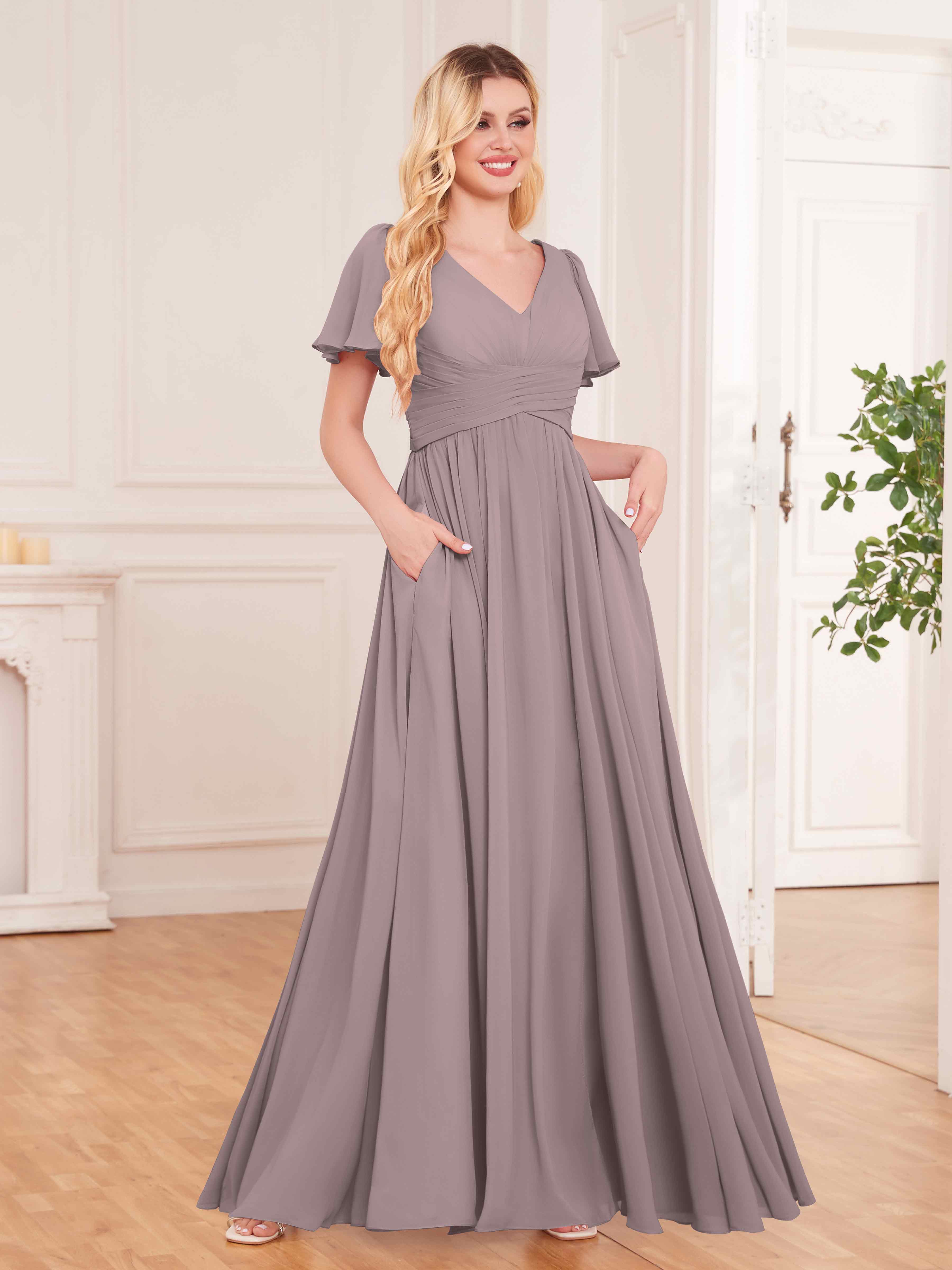 Optez pour la simplicité et la fonctionnalité avec les robes de demoiselle d'honneur. Ces robes présentent un design simple mais élégant avec des manches courtes et une silhouette en mousseline jusqu'au sol. Les poches pratiques sont pratiques et permettent à vos demoiselles d'honneur de garder leurs essentiels à portée de main.