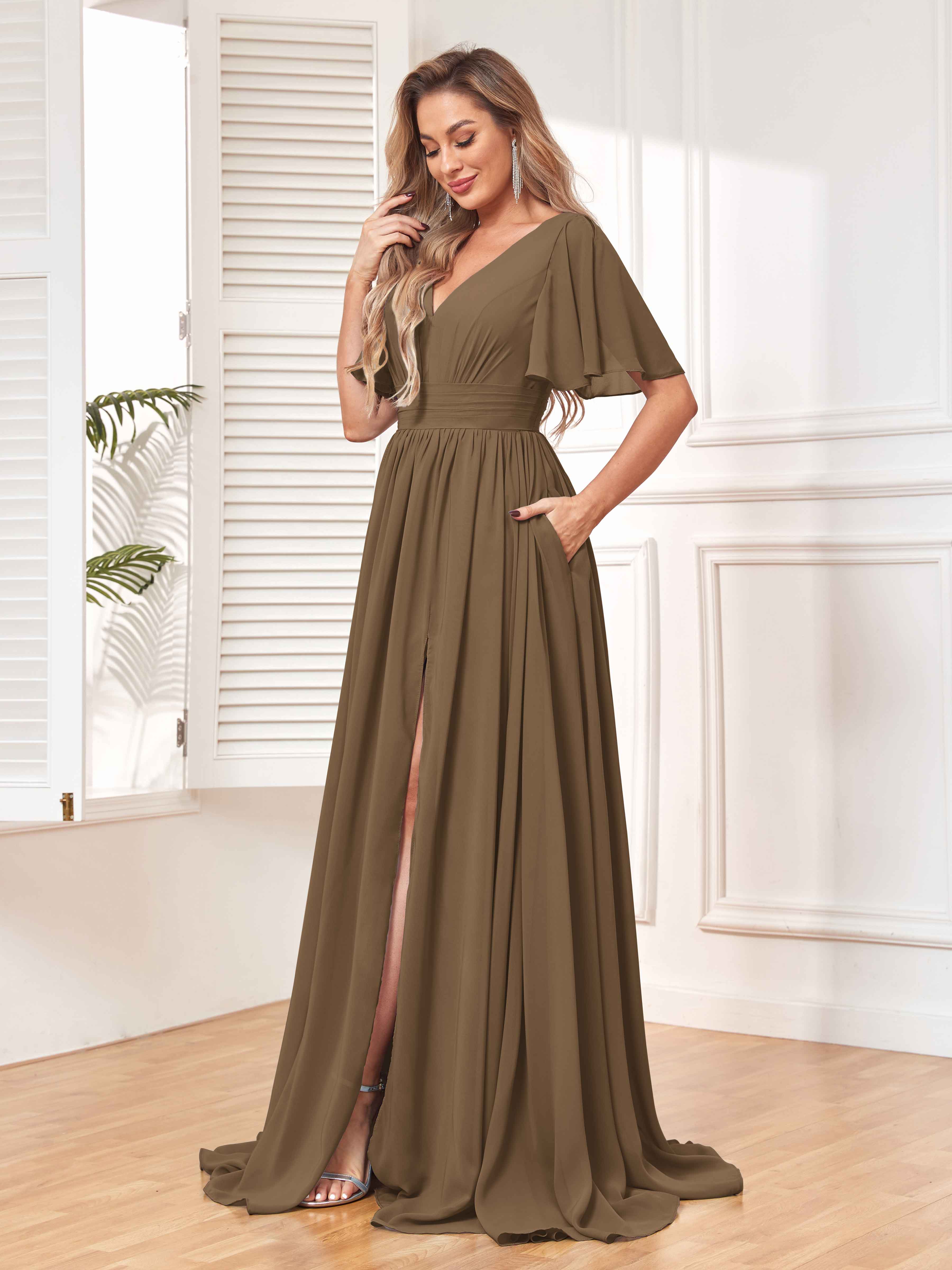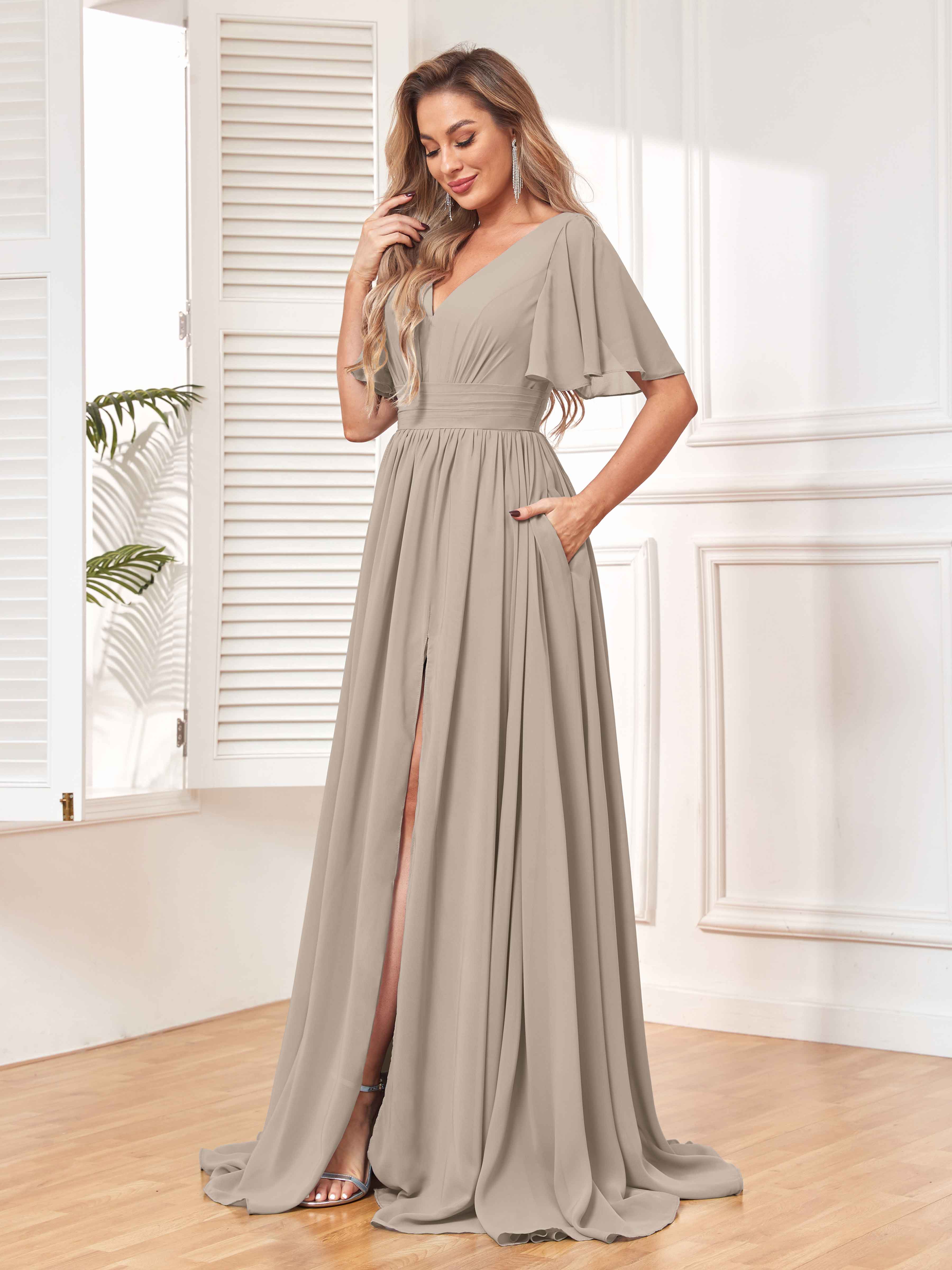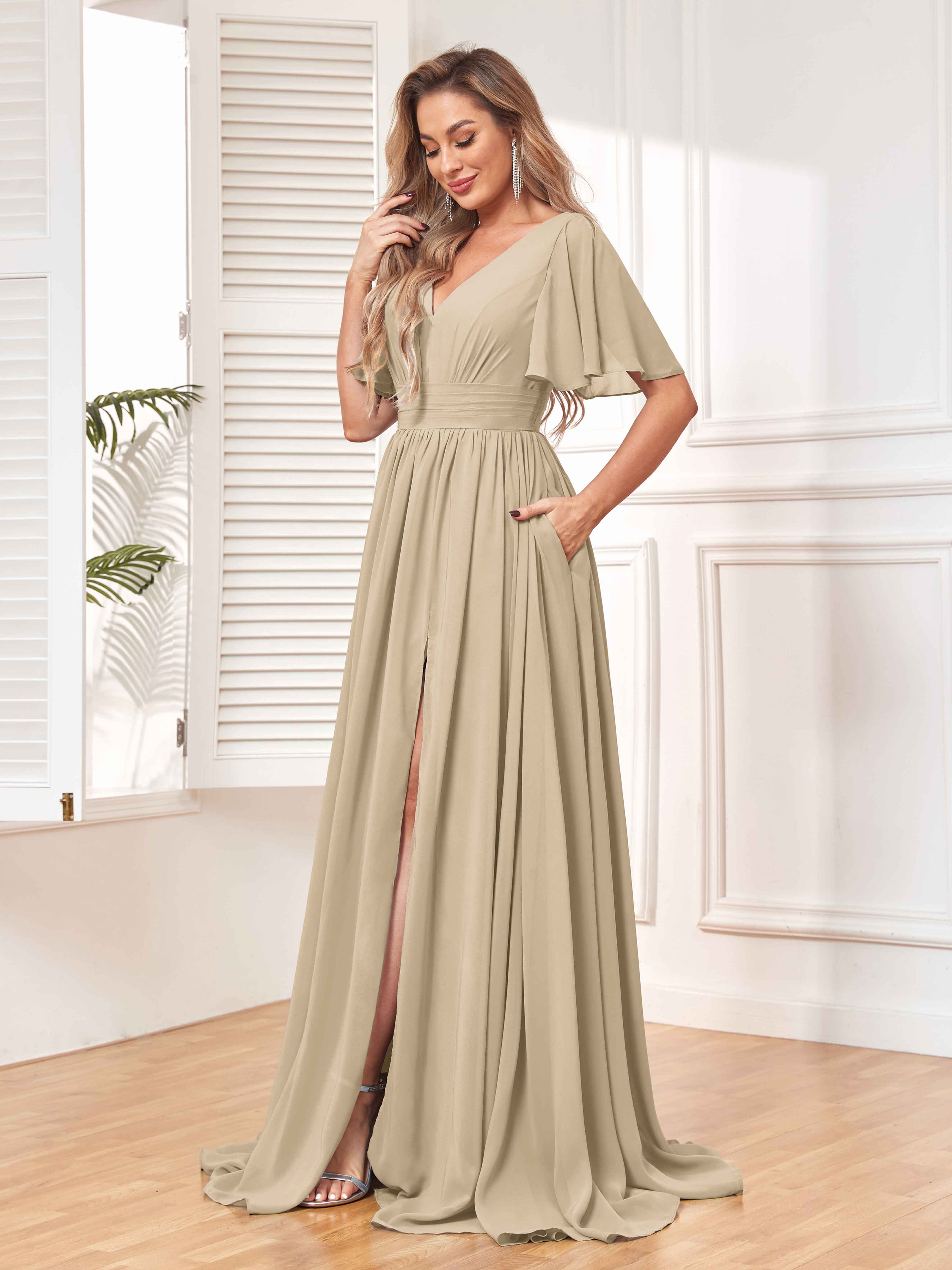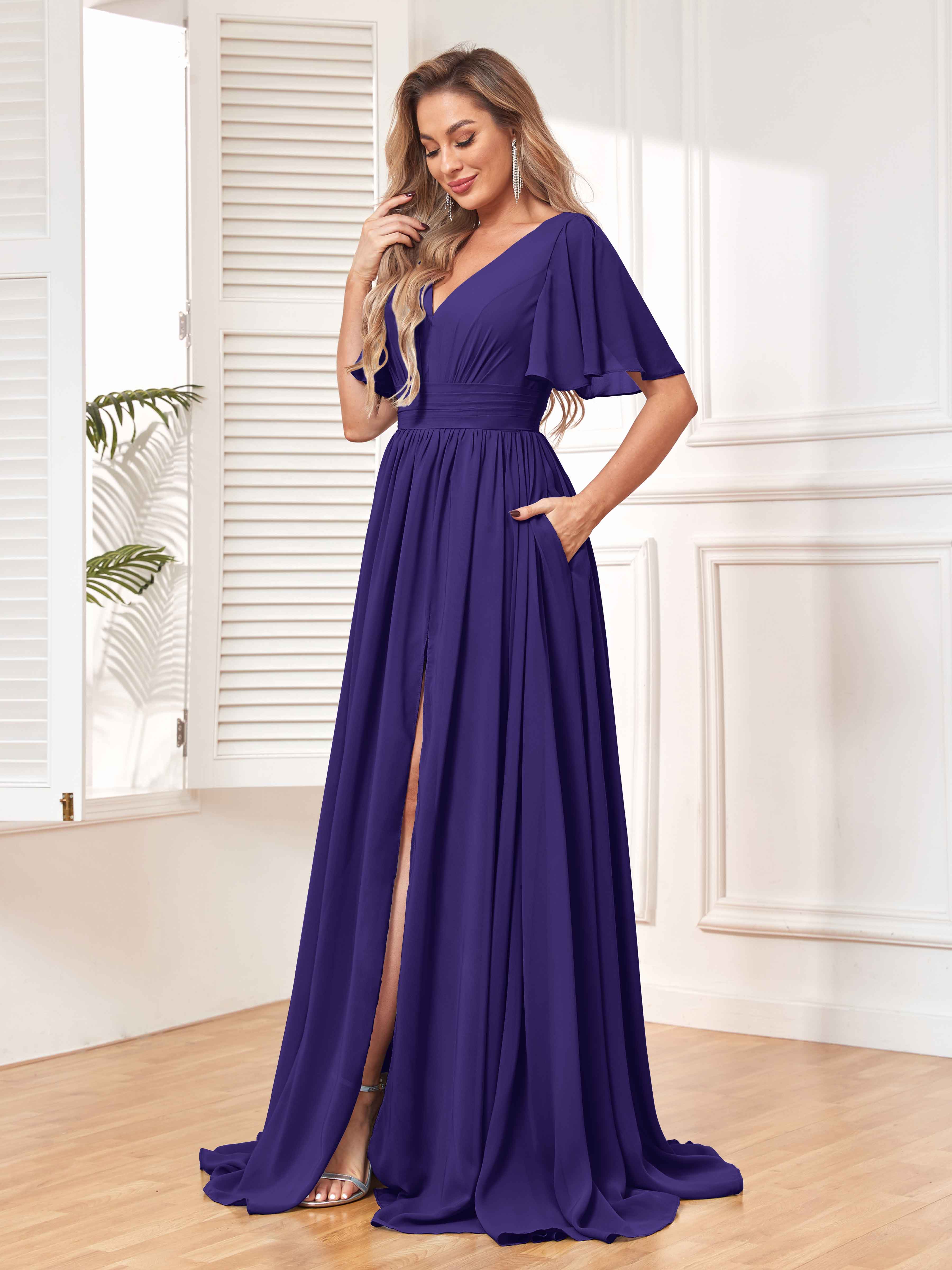 Exprimez un style impeccable avec la robe de demoiselle d'honneur en mousseline fendue à manches courtes Brooklyn Impeccable de Pomuyoo.fr. Le design à manches courtes, les détails fendus et le tissu en mousseline fluide créent une robe chic et élégante, parfaite pour une soirée nuptiale élégante.