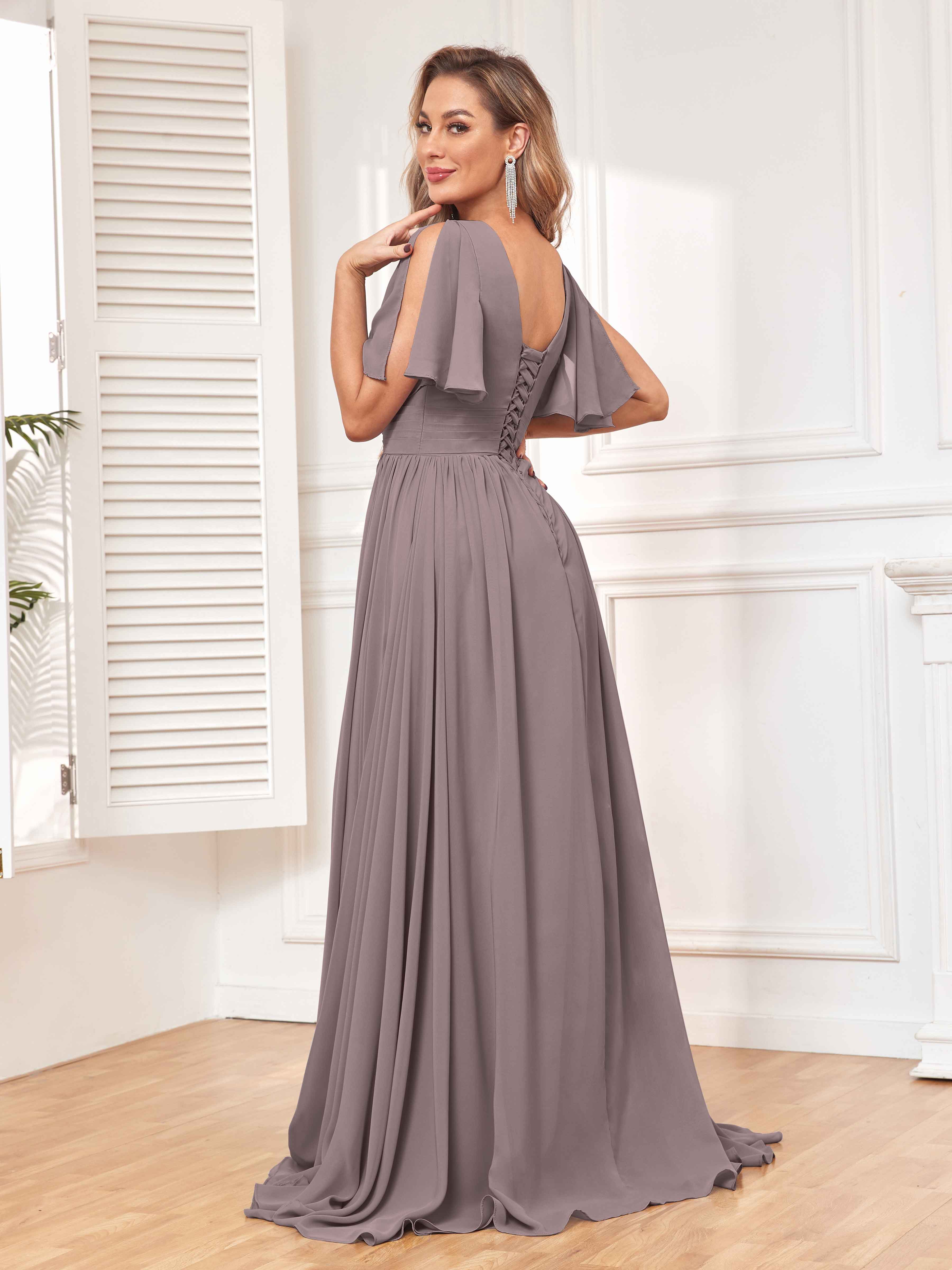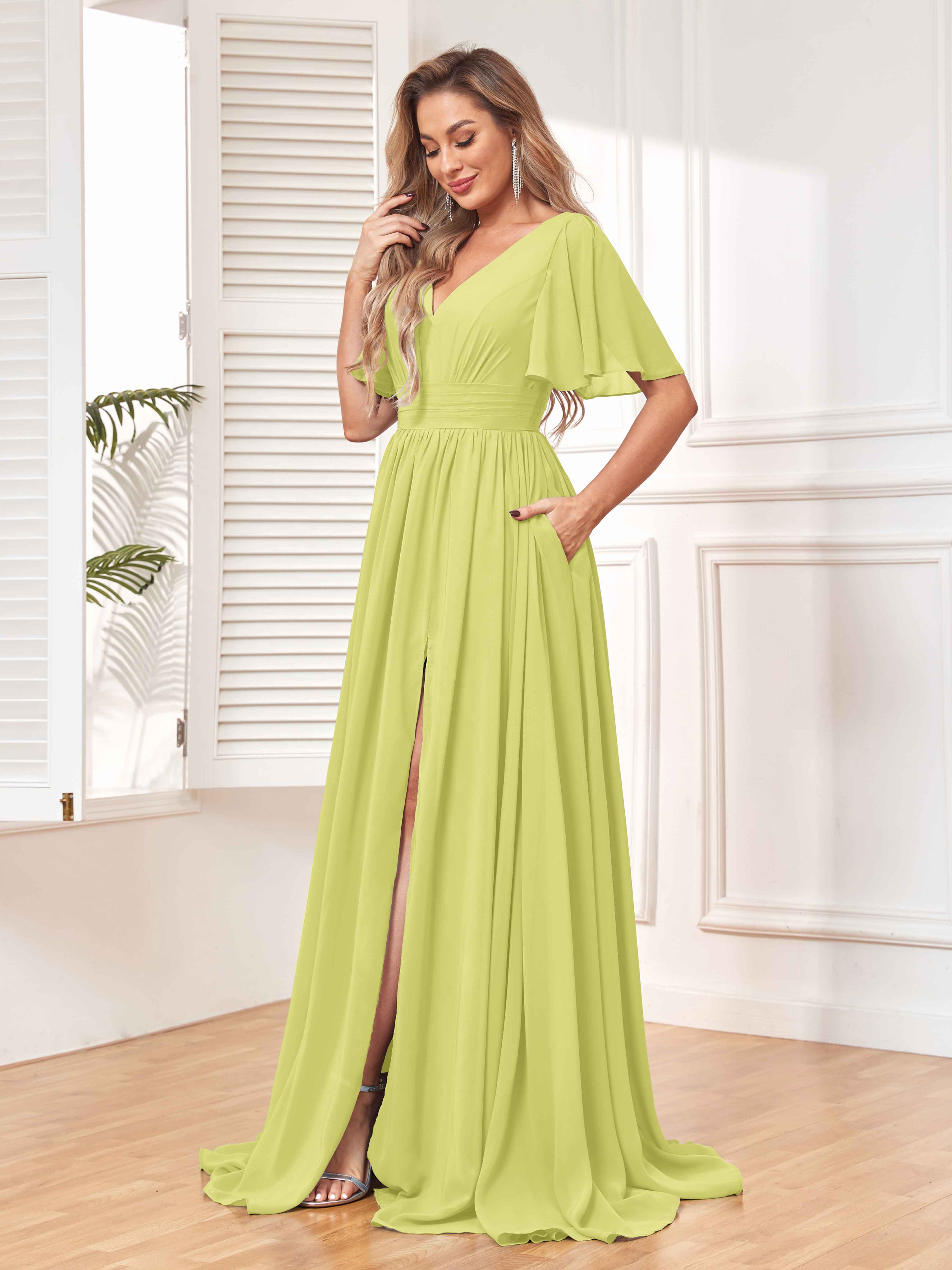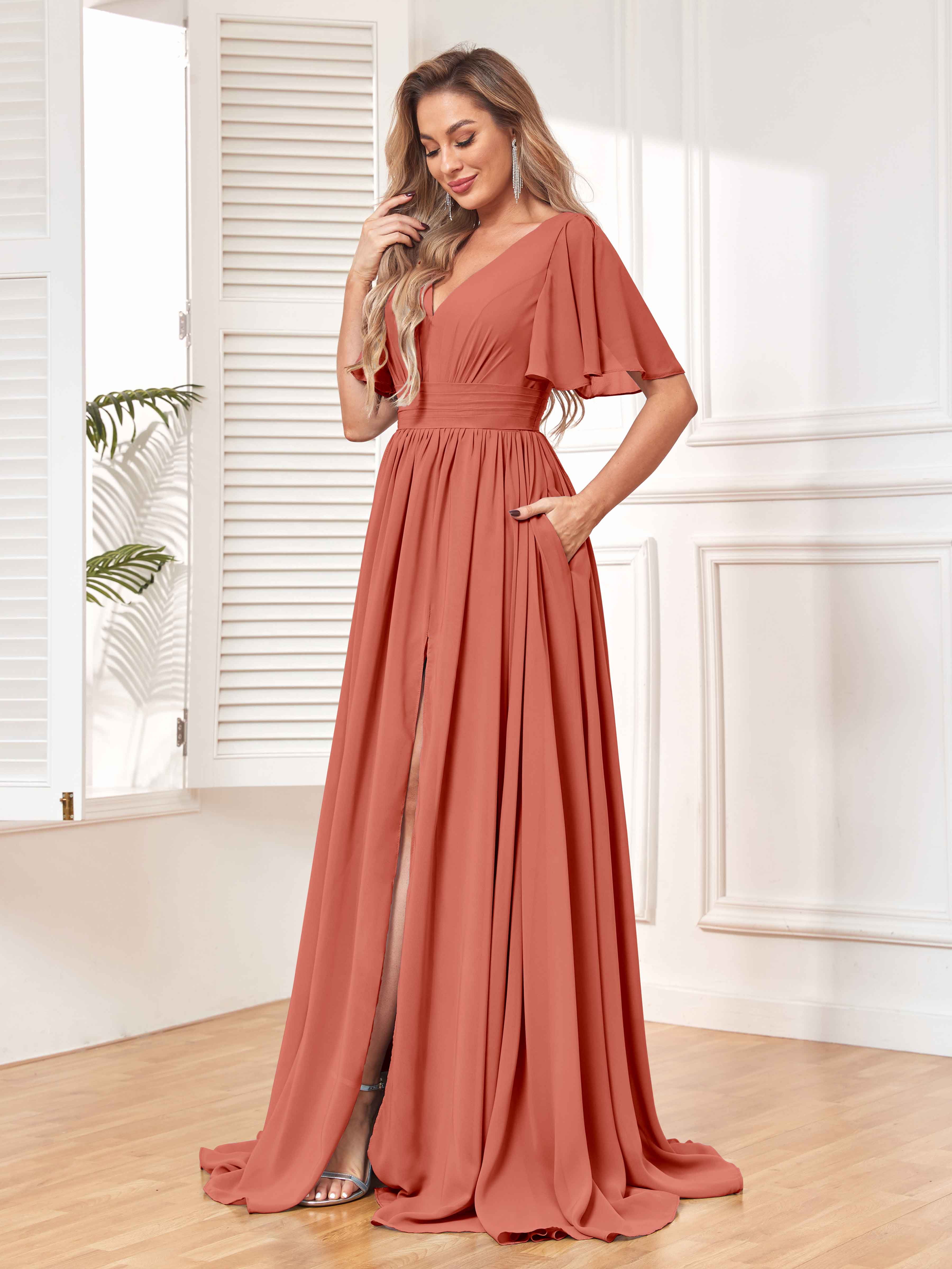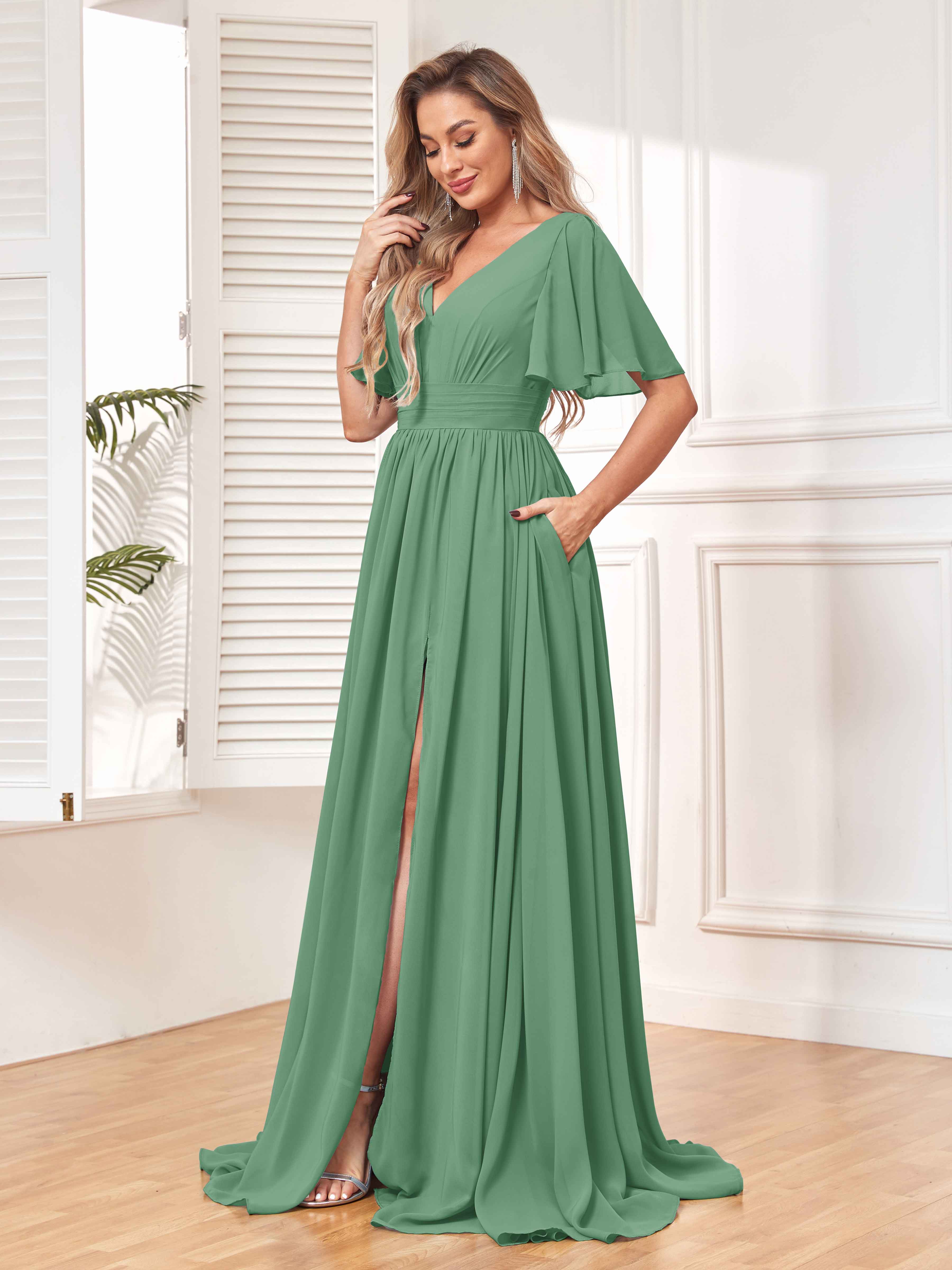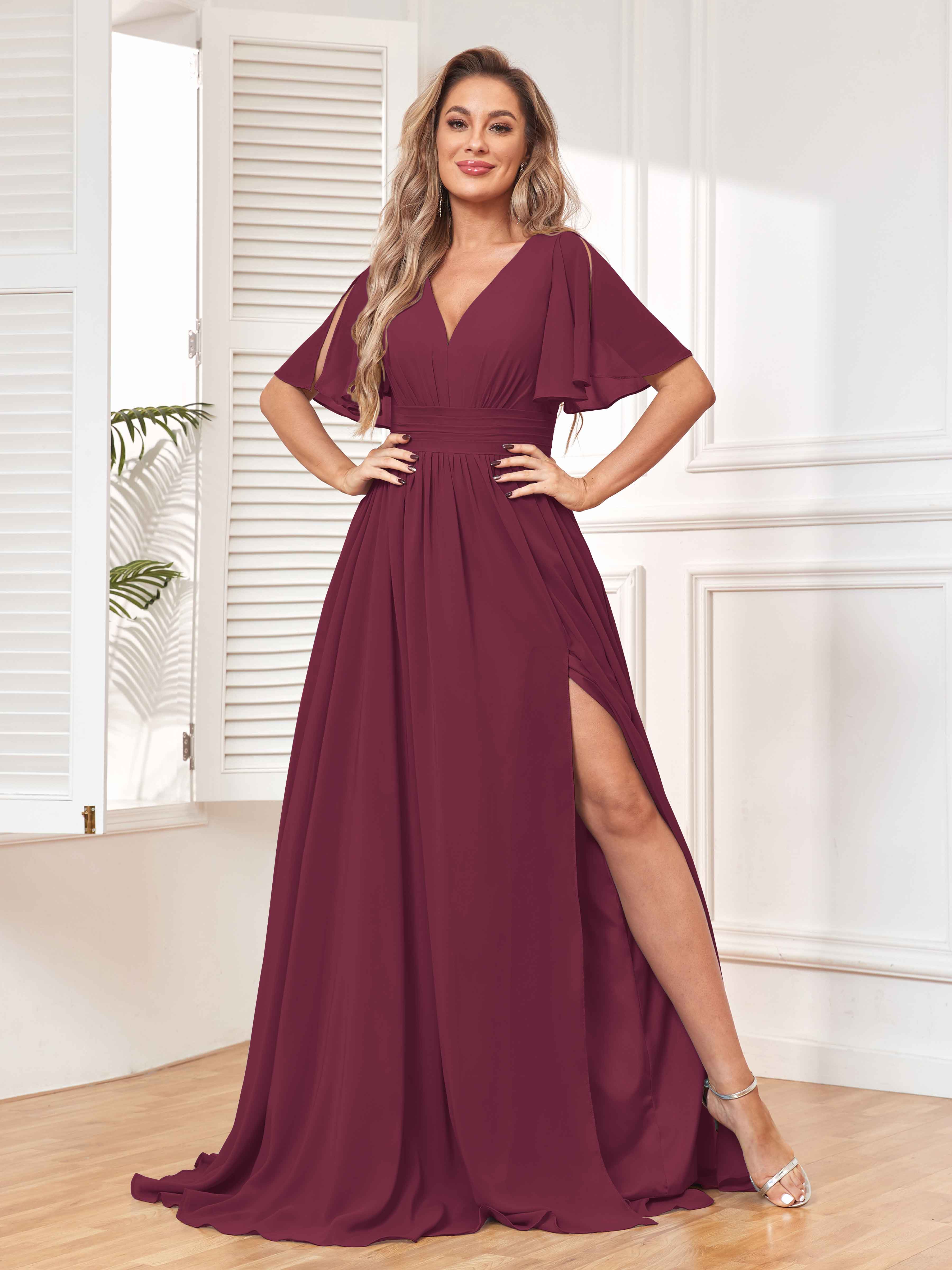 Exprimez un style impeccable avec la robe de demoiselle d'honneur en mousseline fendue à manches courtes Brooklyn Impeccable de Pomuyoo.fr. Le design à manches courtes, les détails fendus et le tissu en mousseline fluide créent une robe chic et élégante, parfaite pour une soirée nuptiale élégante.