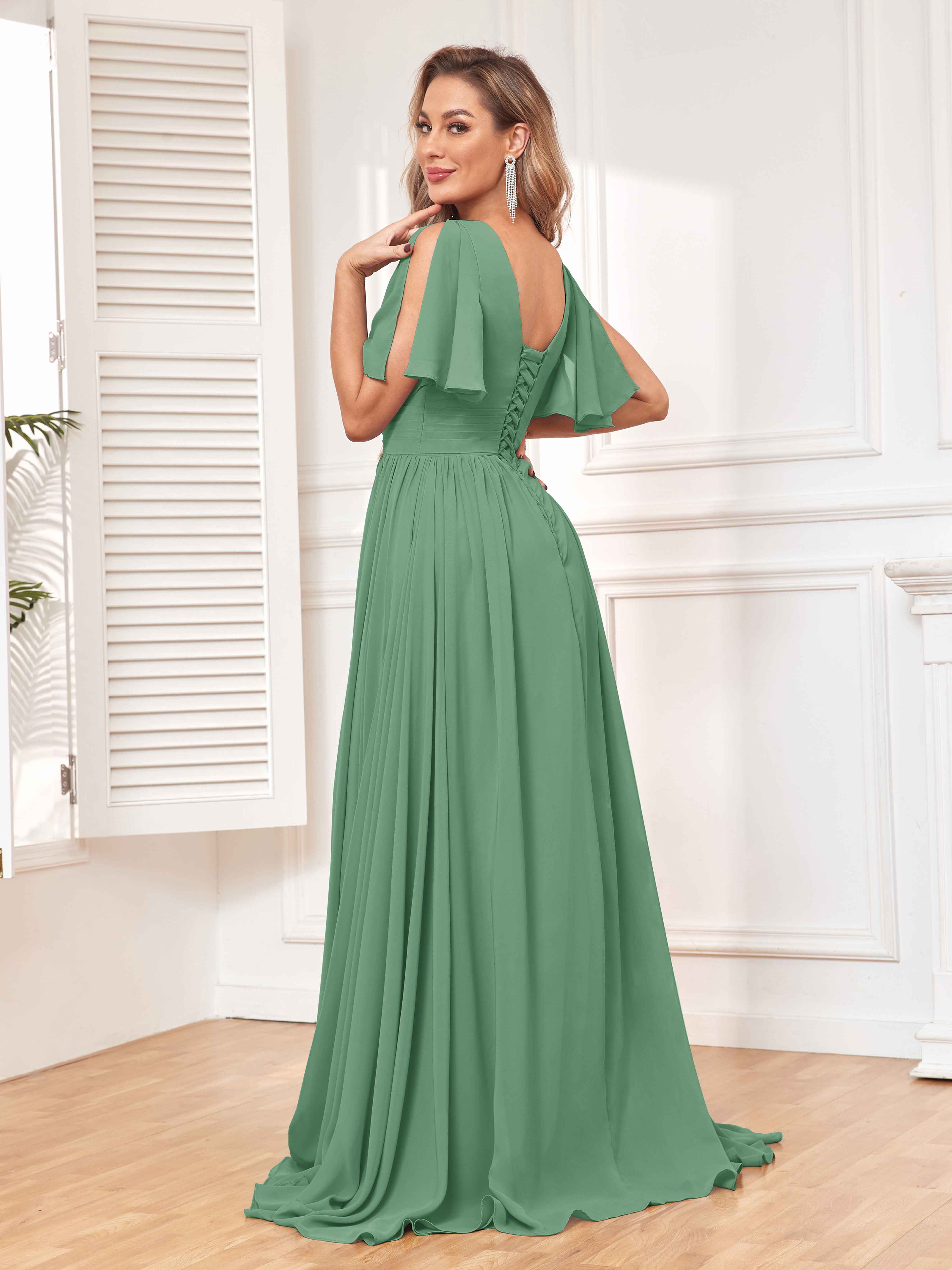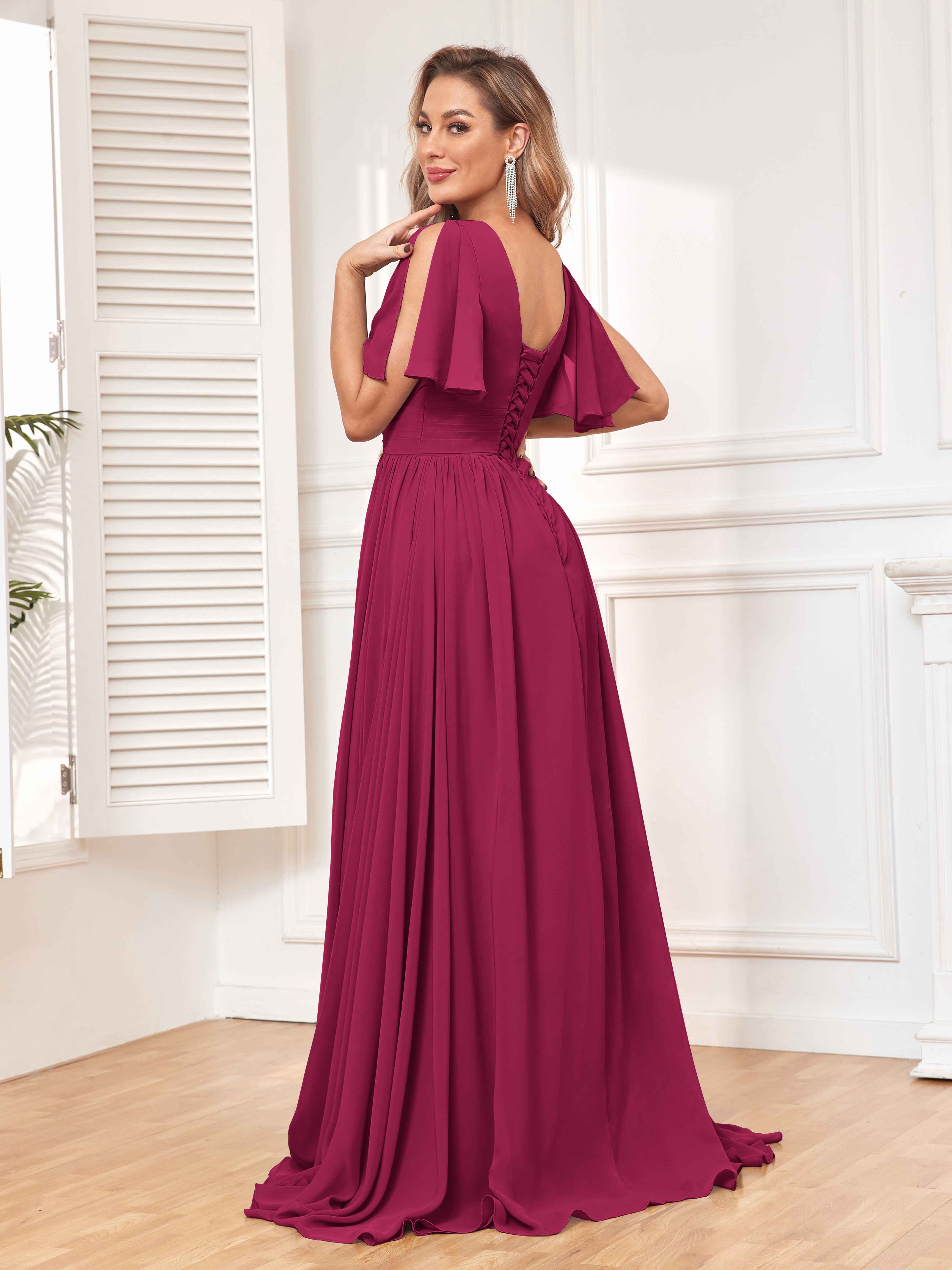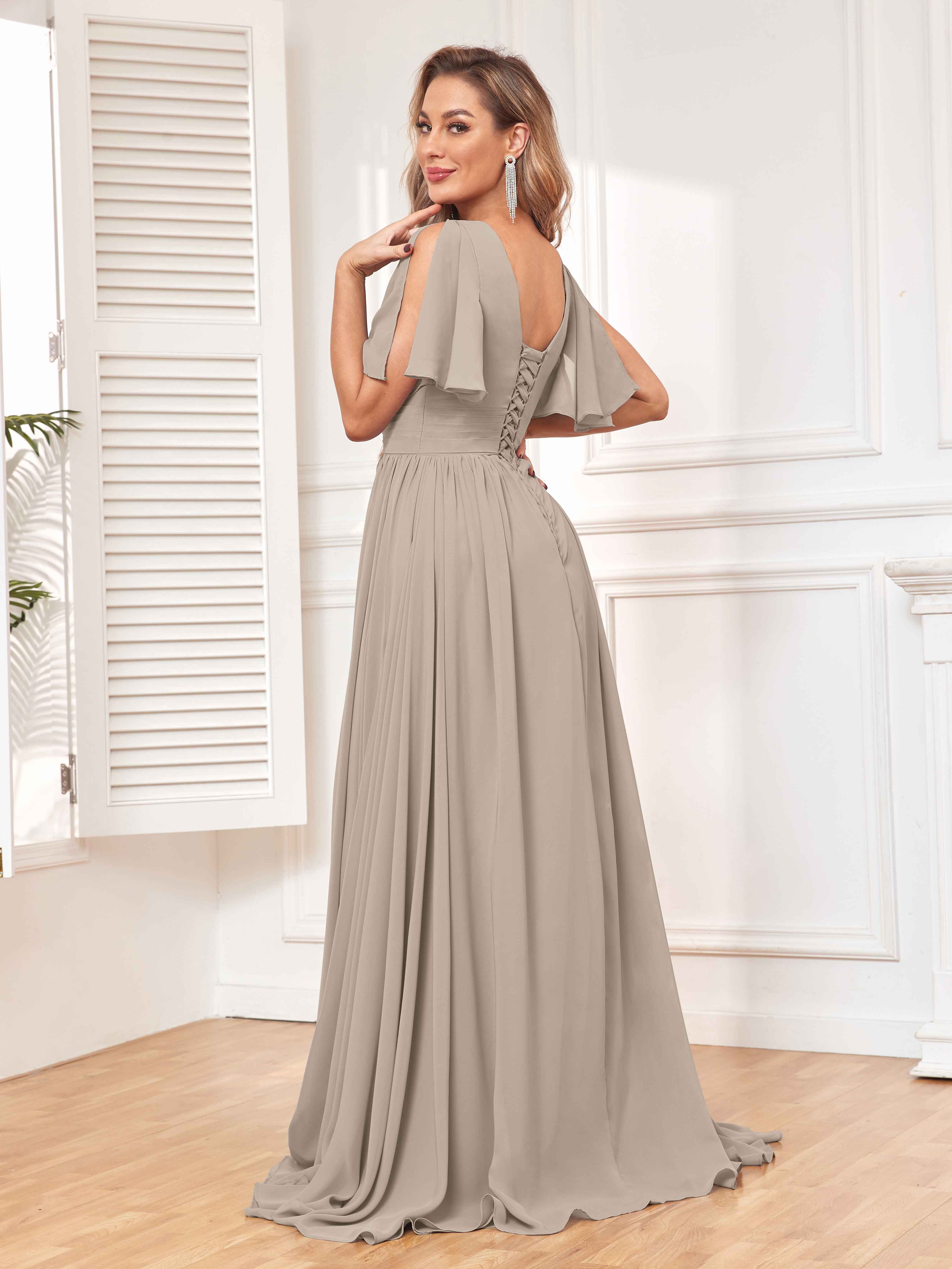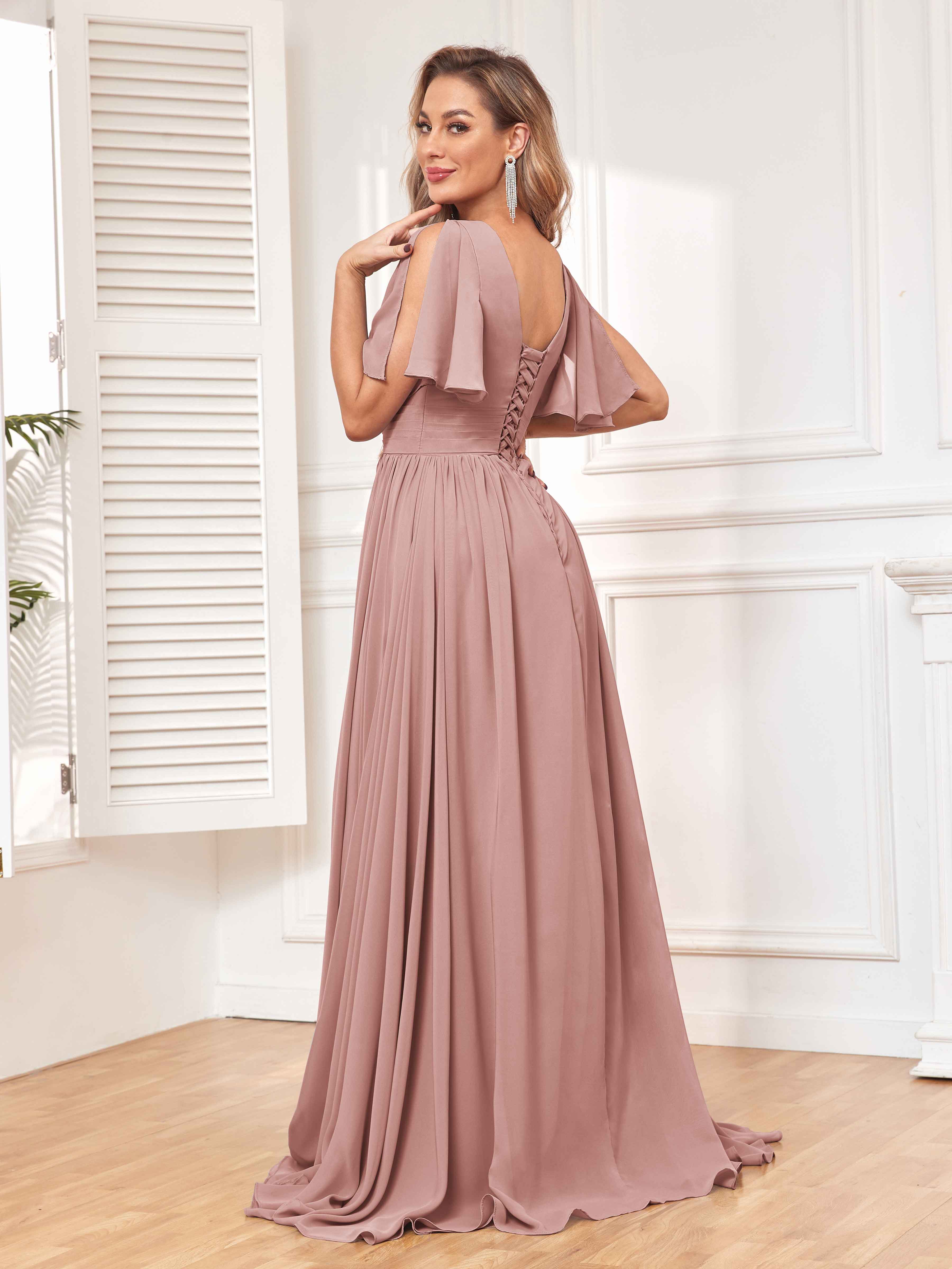 Exprimez un style impeccable avec la robe de demoiselle d'honneur en mousseline fendue à manches courtes Brooklyn Impeccable de Pomuyoo.fr. Le design à manches courtes, les détails fendus et le tissu en mousseline fluide créent une robe chic et élégante, parfaite pour une soirée nuptiale élégante.