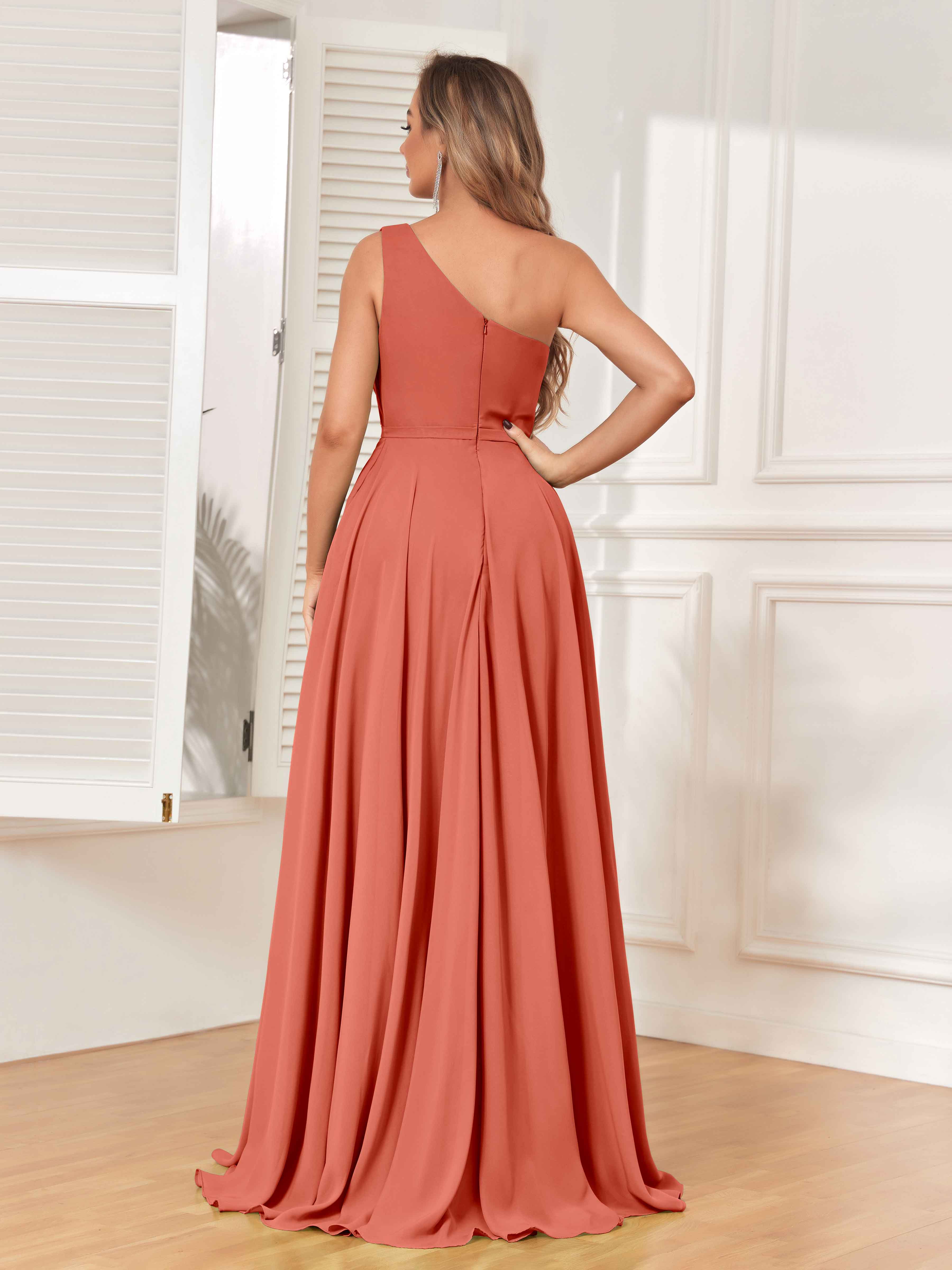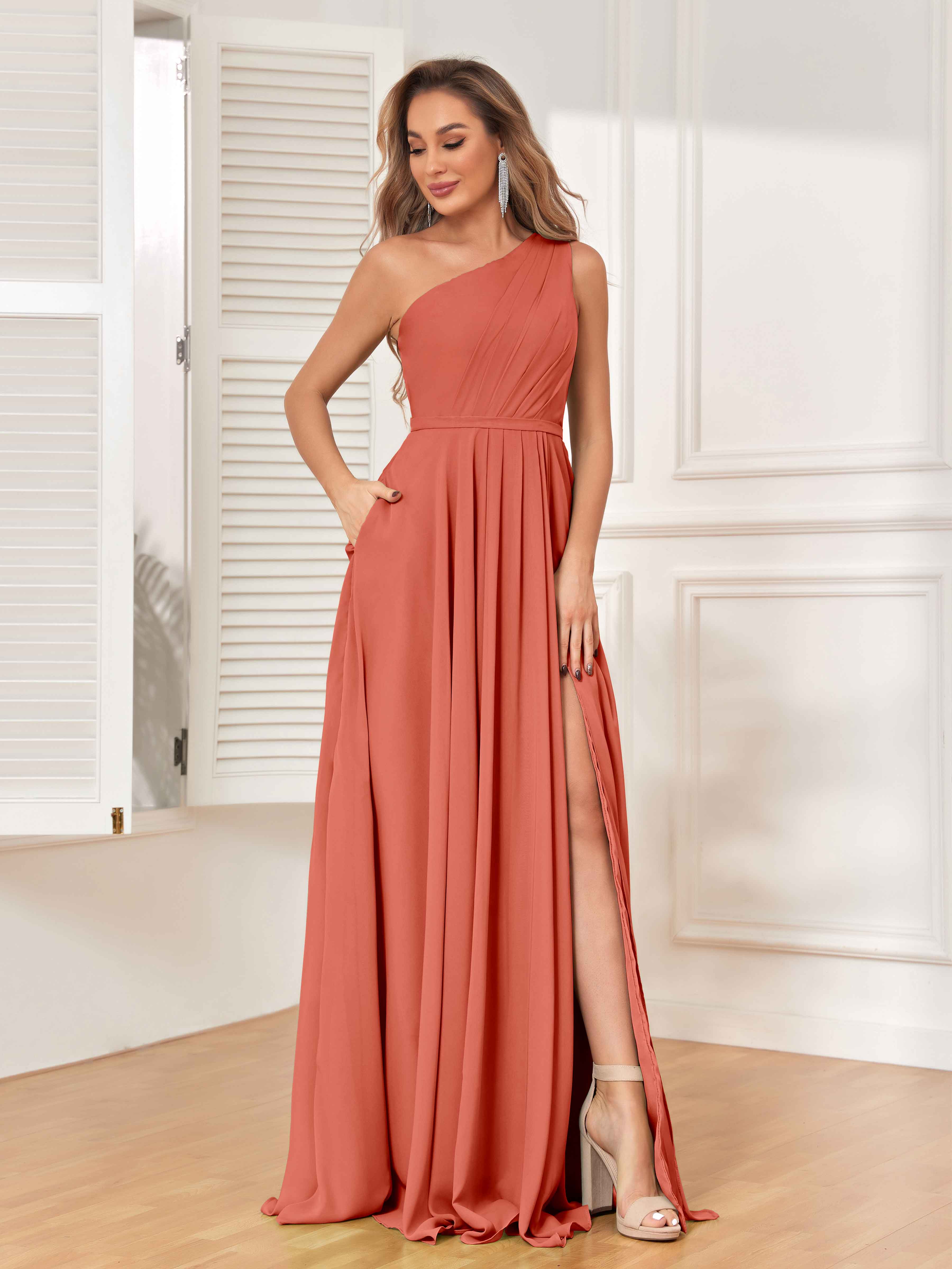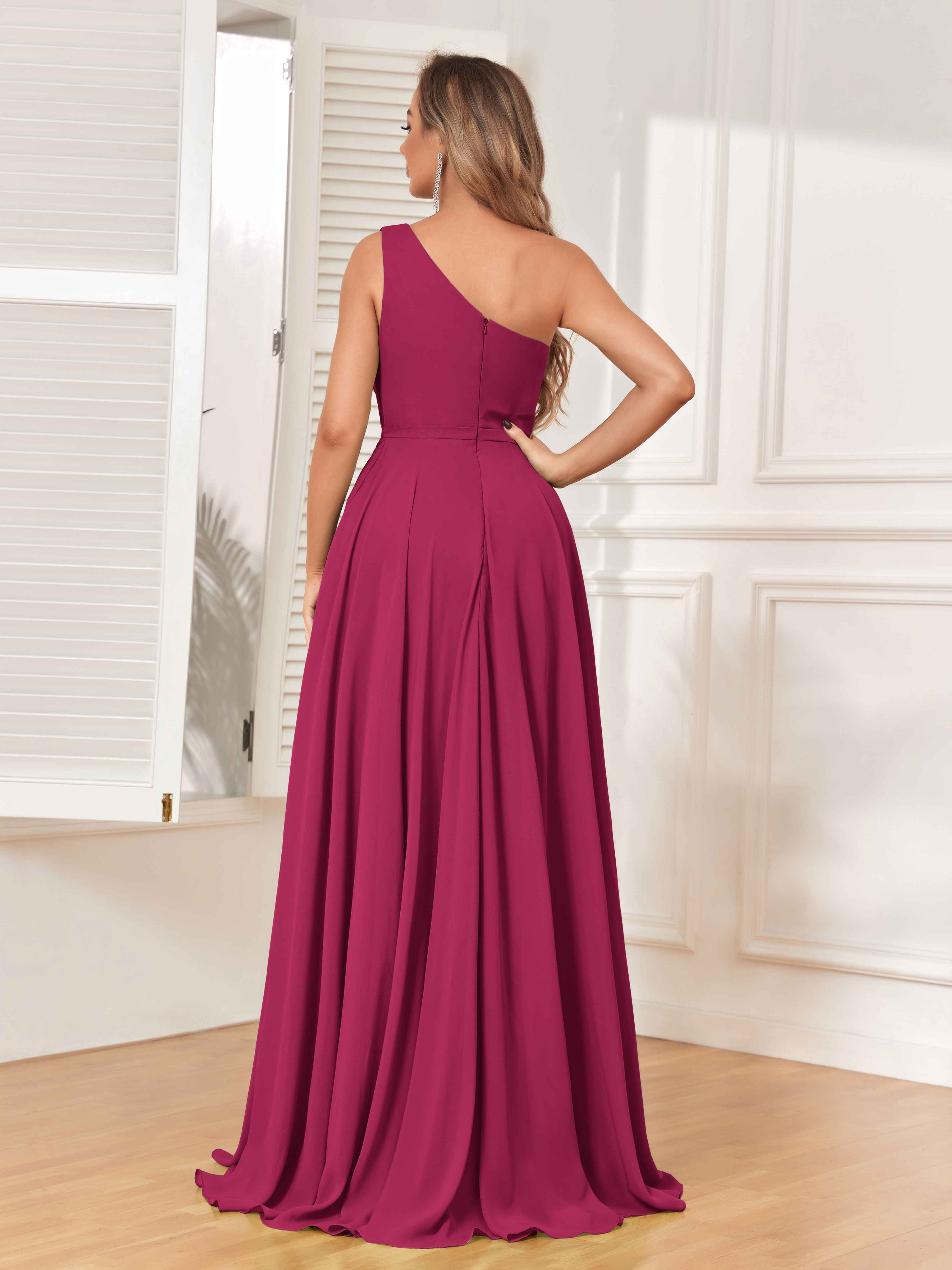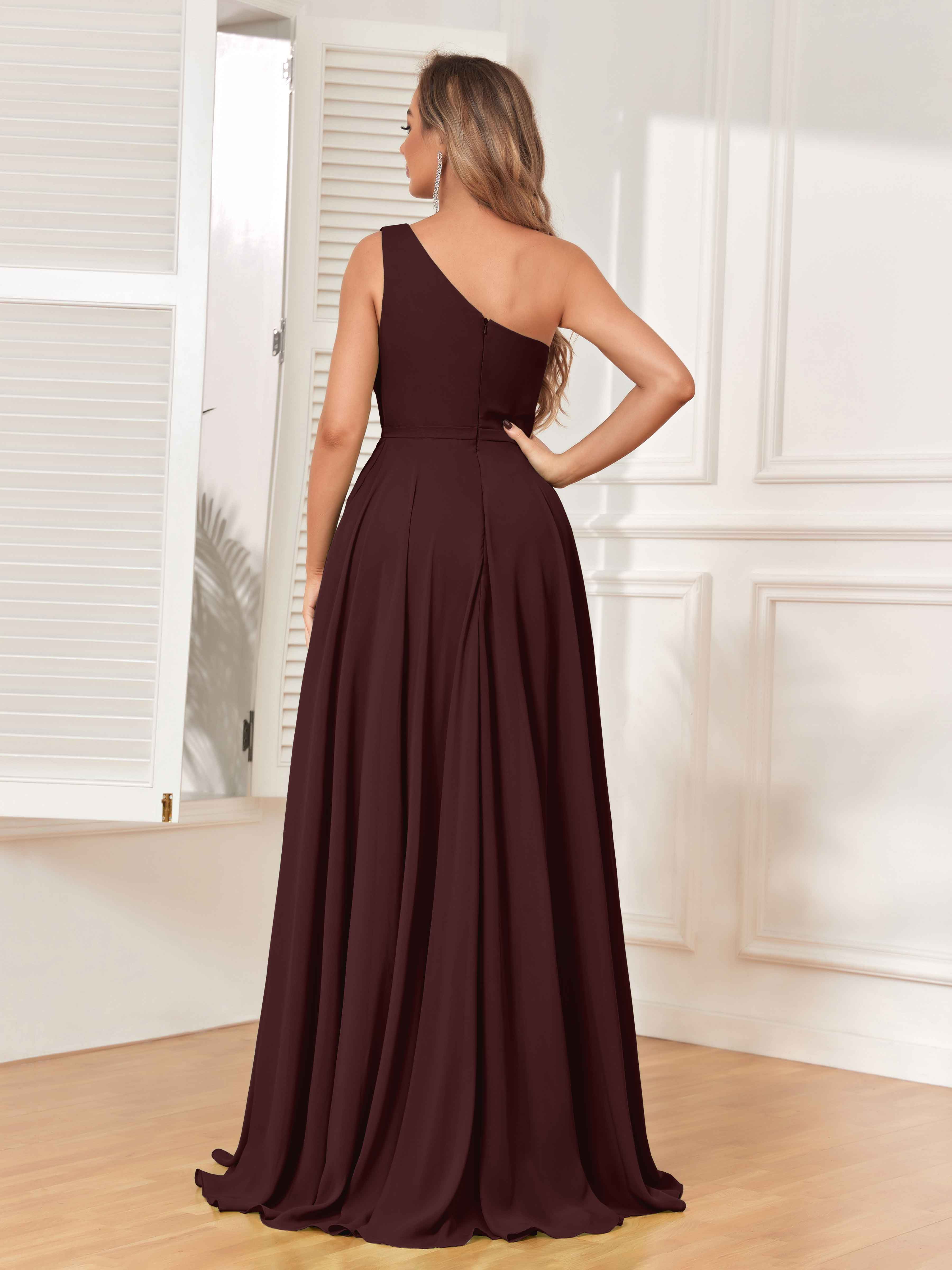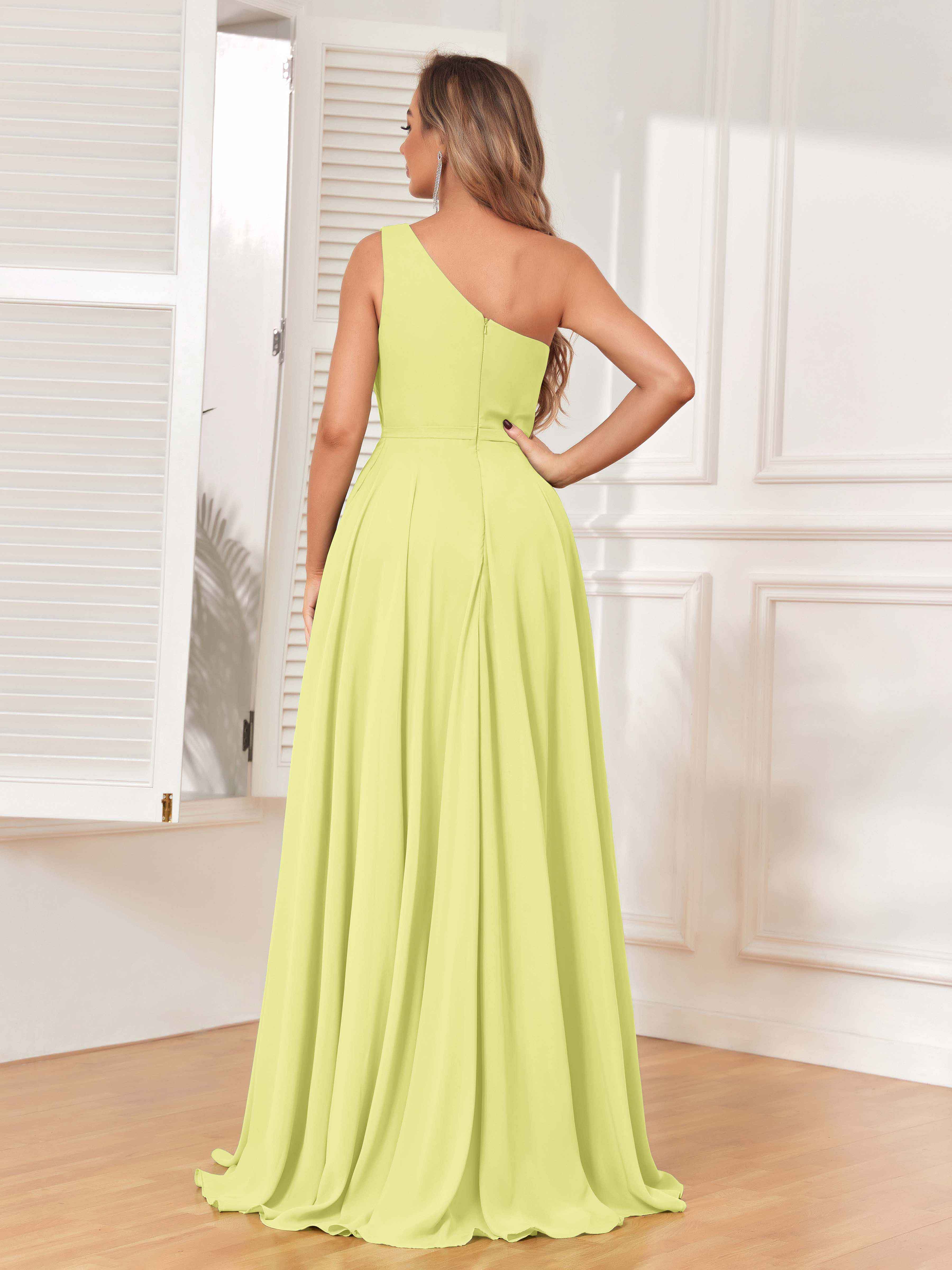 Faites une déclaration moderne avec la robe de demoiselle d'honneur en mousseline de soie Stella Modern à une épaule et longueur au sol de Pomuyoo.fr. Cette robe présente un design contemporain à une épaule et un tissu en mousseline fluide, créant un look sophistiqué et élégant pour tout mariage.