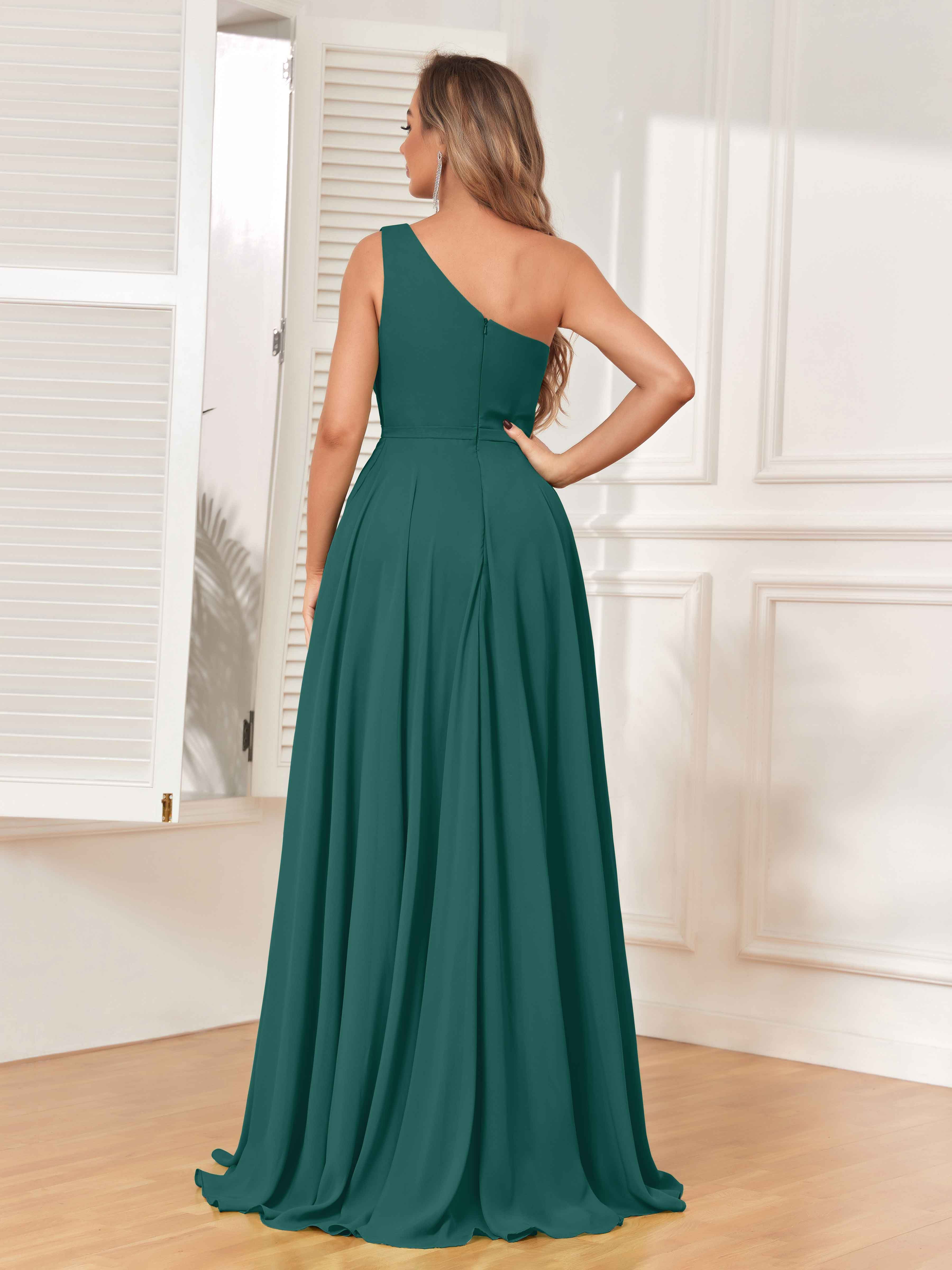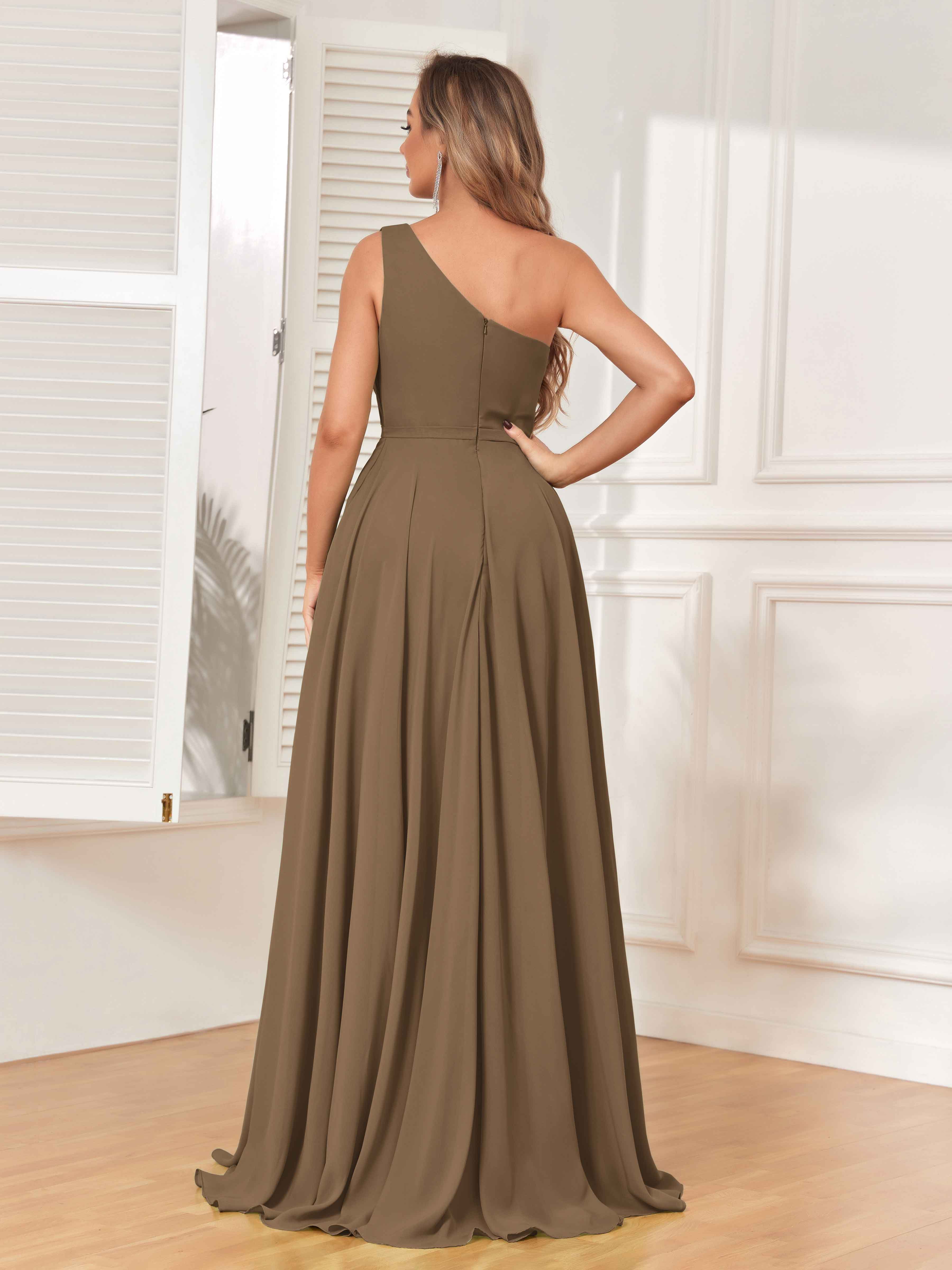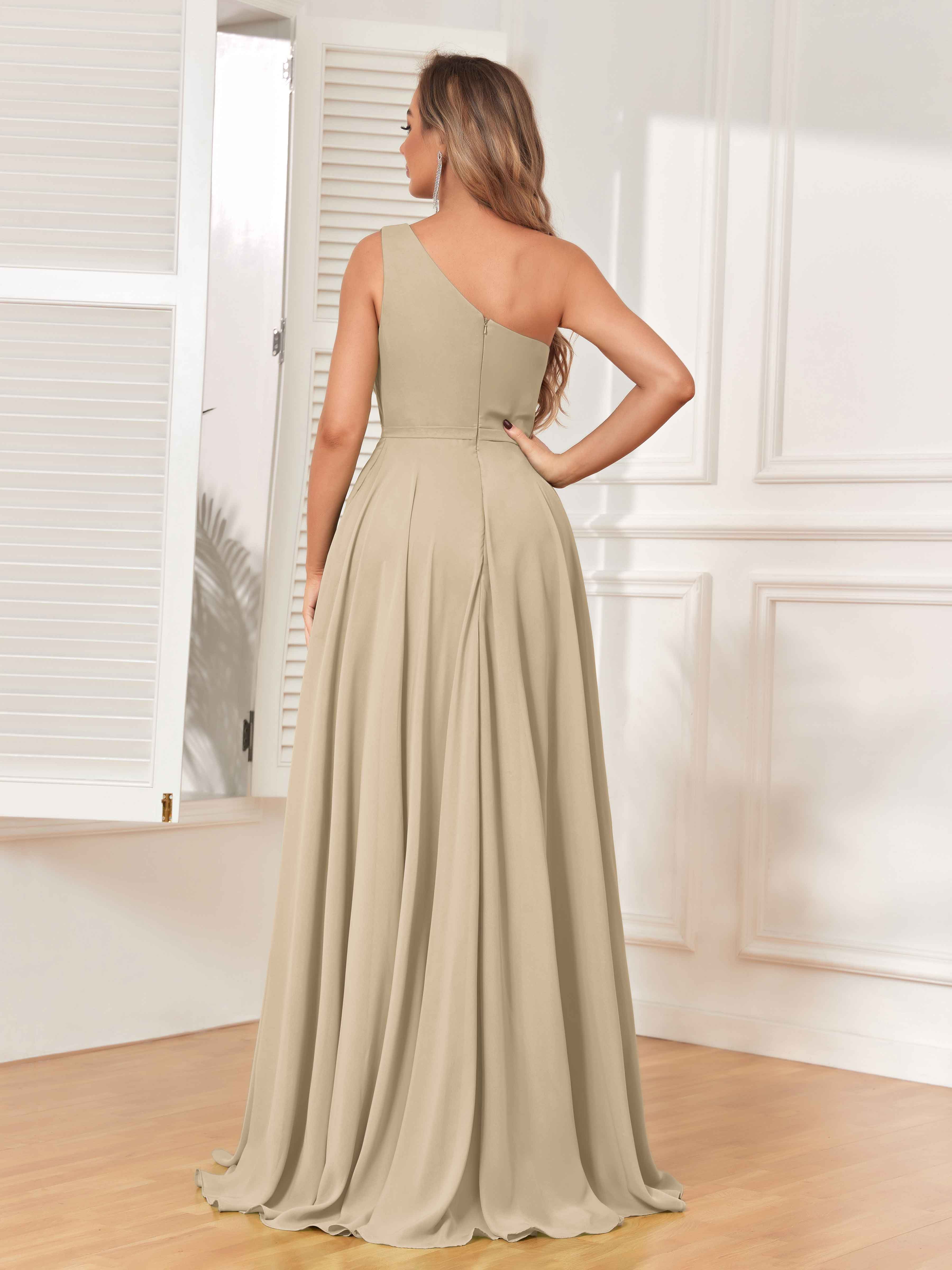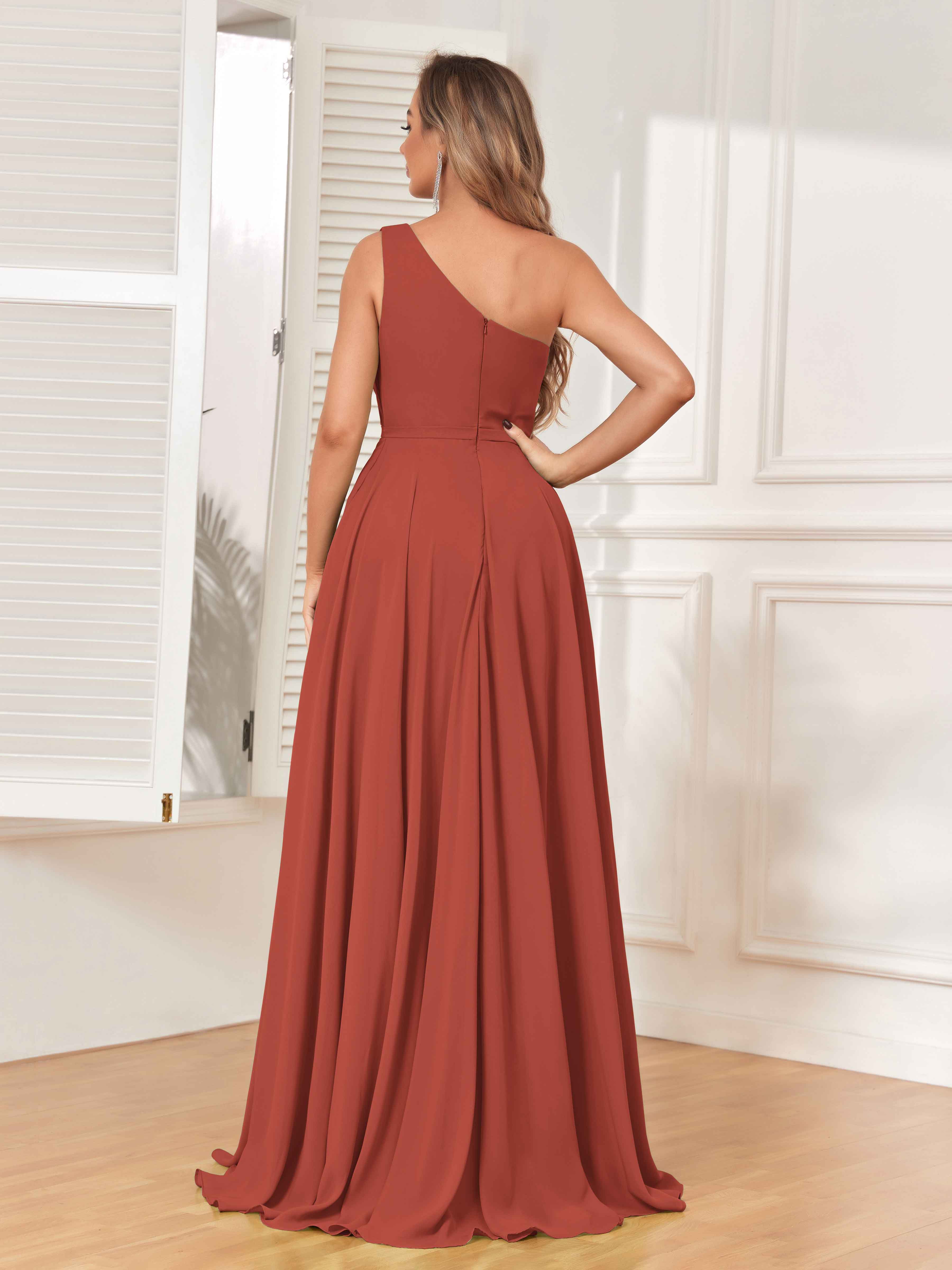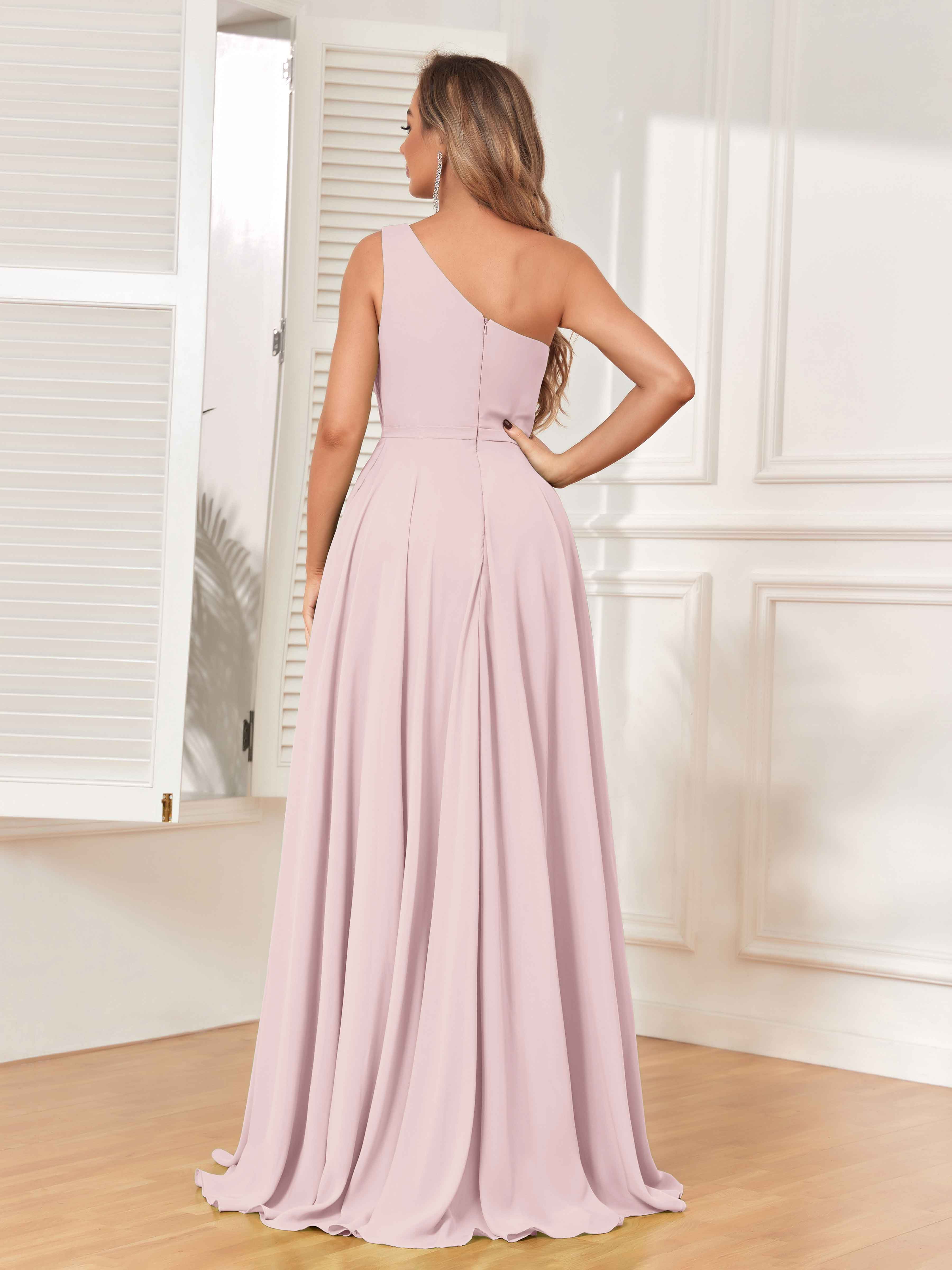 Faites une déclaration moderne avec la robe de demoiselle d'honneur en mousseline de soie Stella Modern à une épaule et longueur au sol de Pomuyoo.fr. Cette robe présente un design contemporain à une épaule et un tissu en mousseline fluide, créant un look sophistiqué et élégant pour tout mariage.