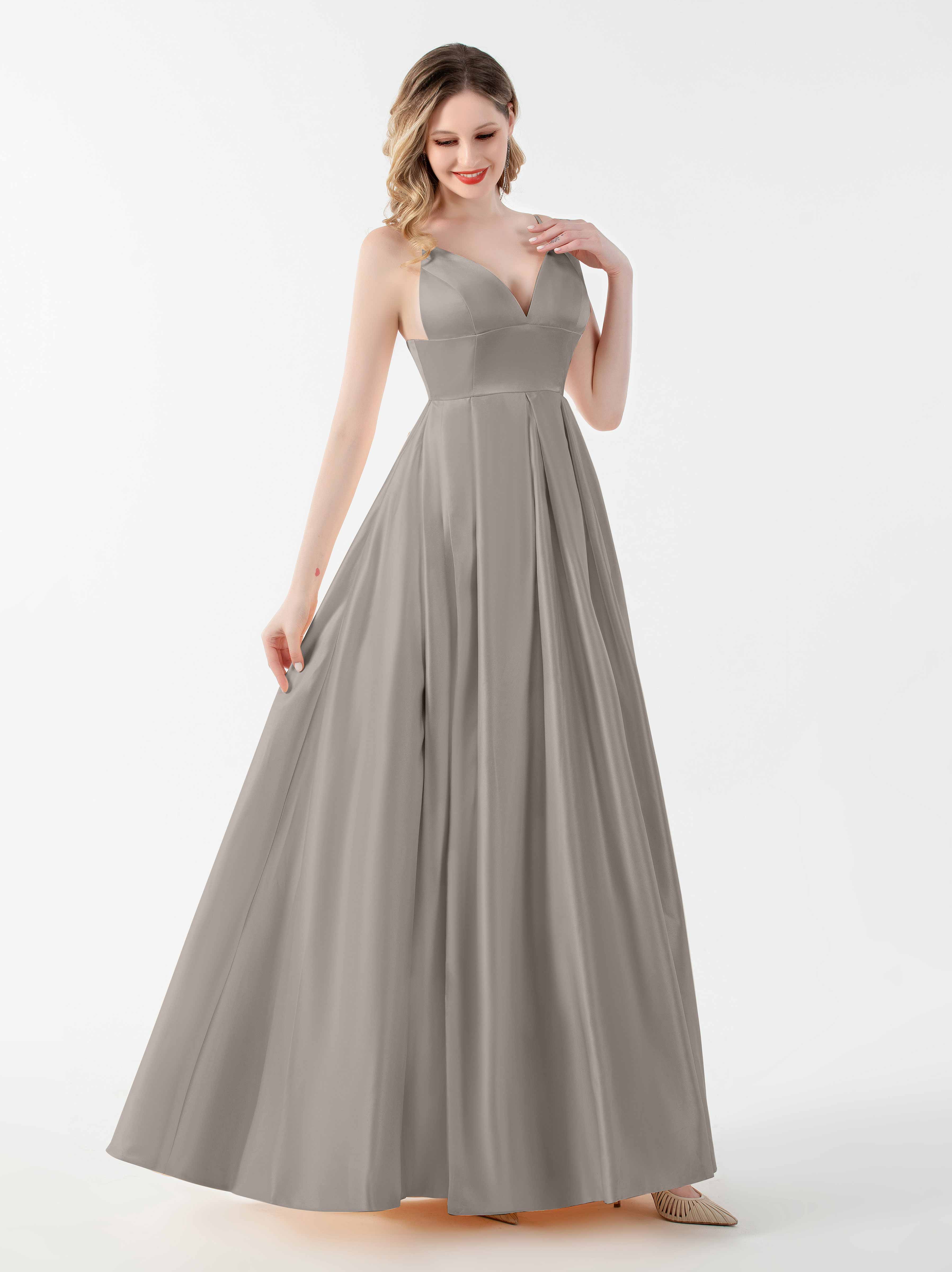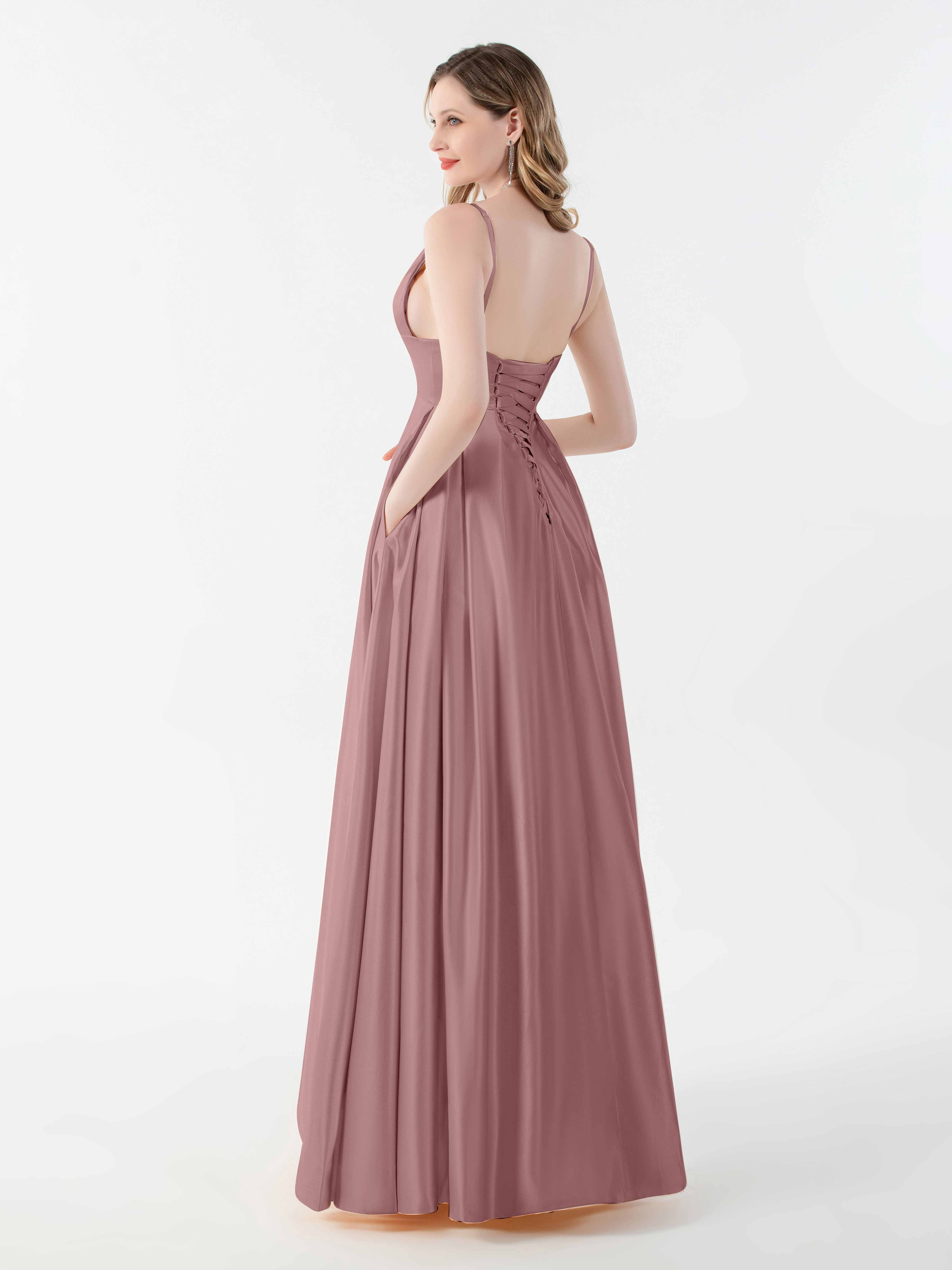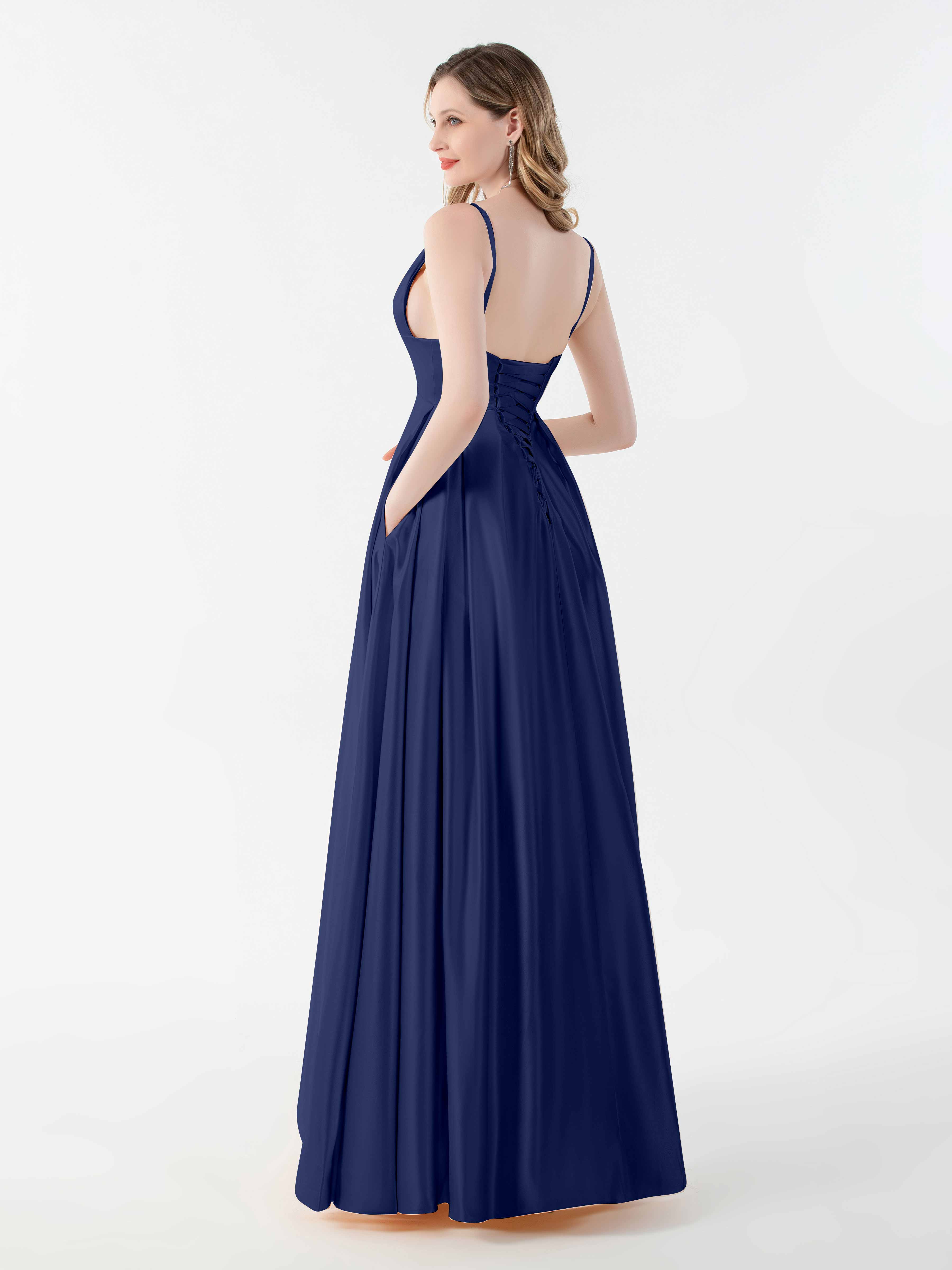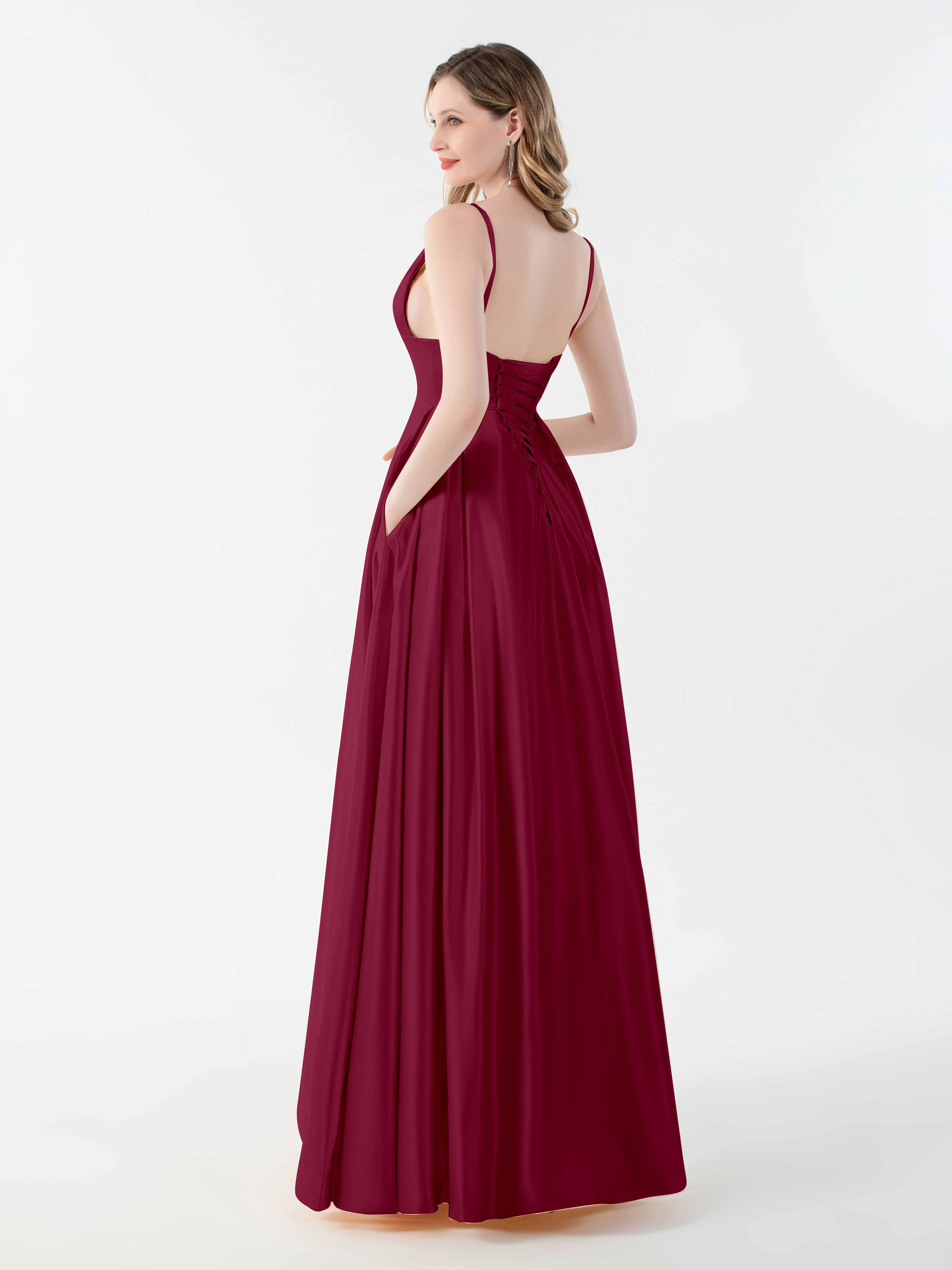 Robes En Satin À Fente À Jambe Et Col V Avec Poches Noelle