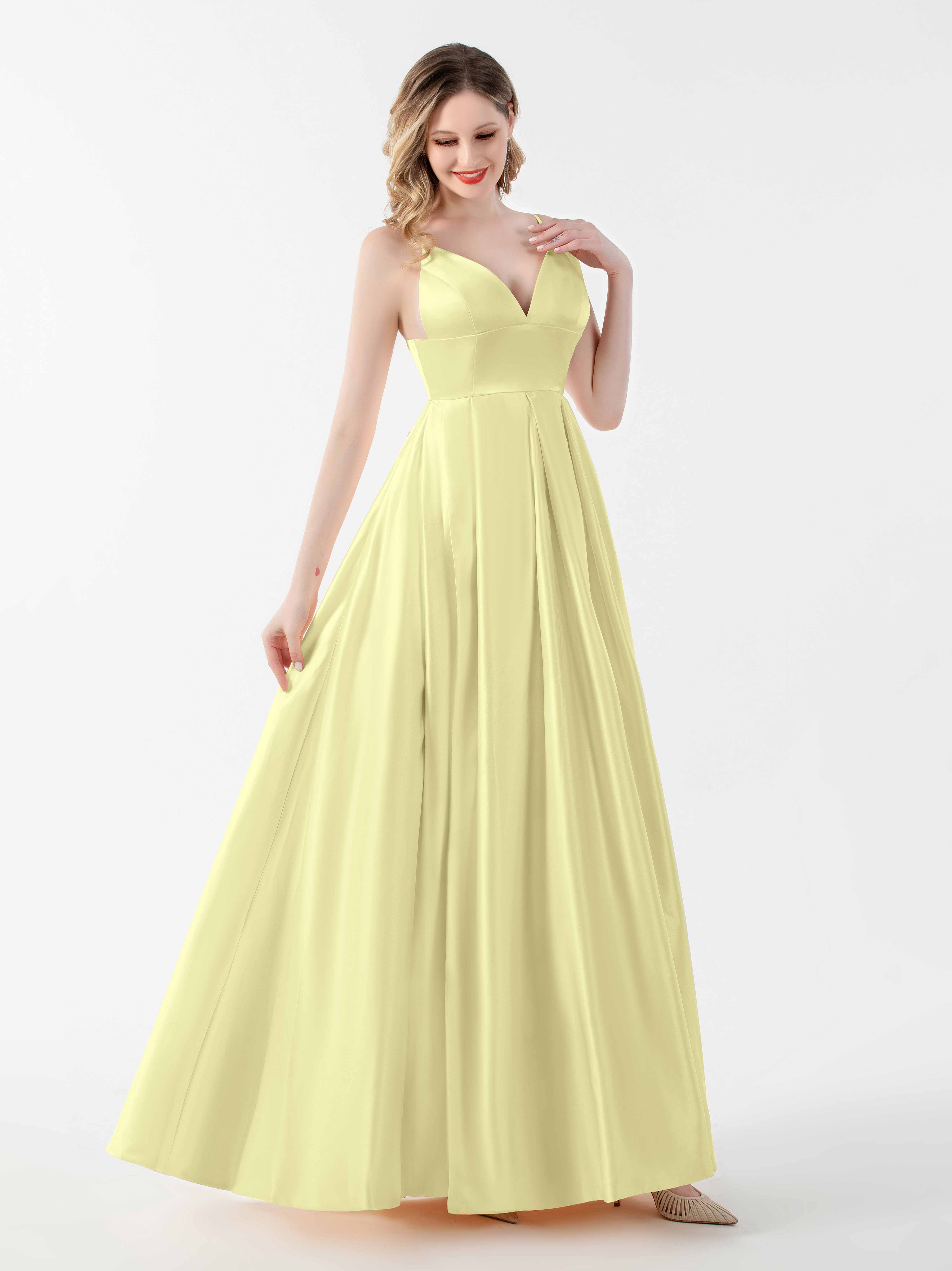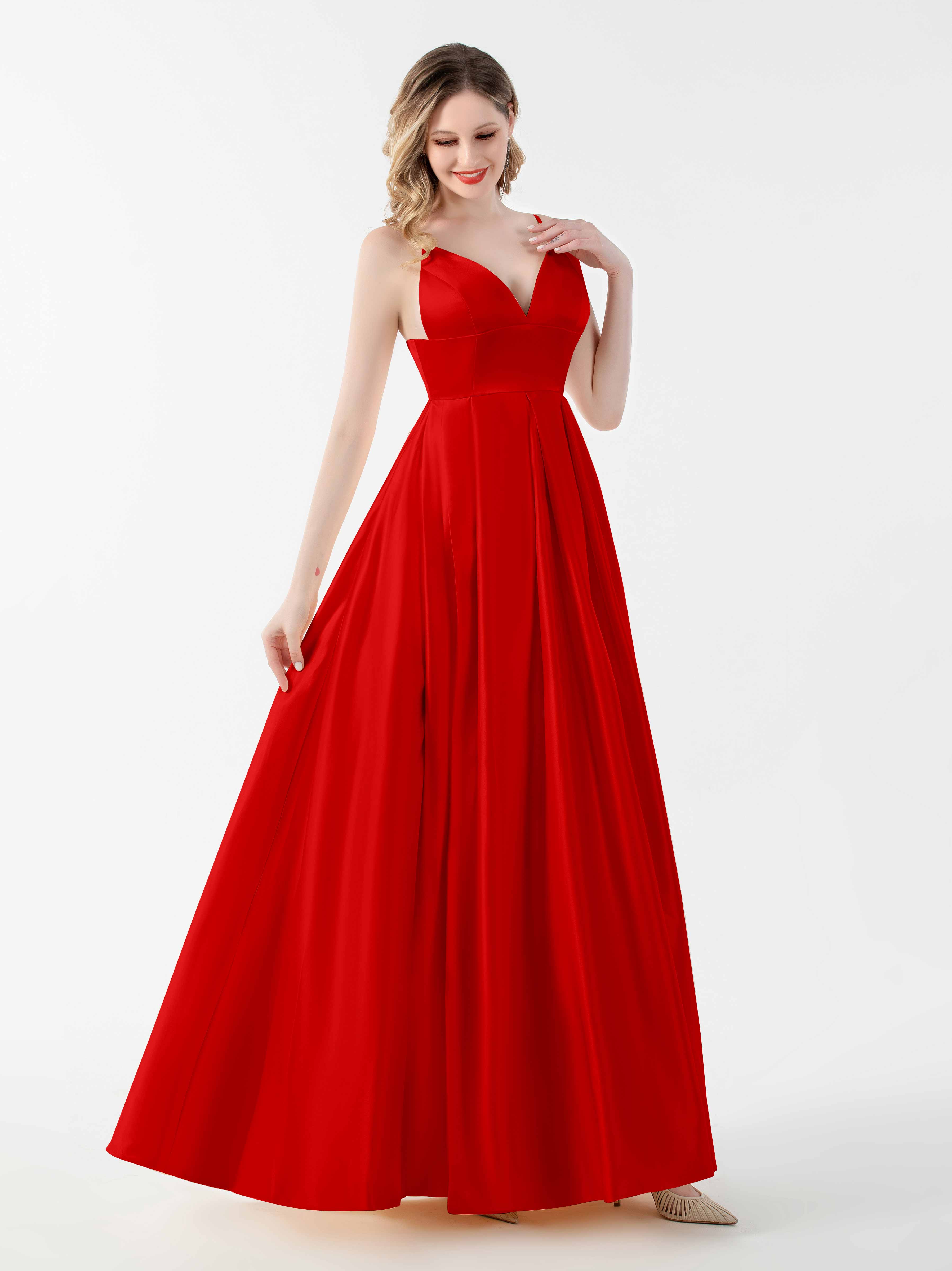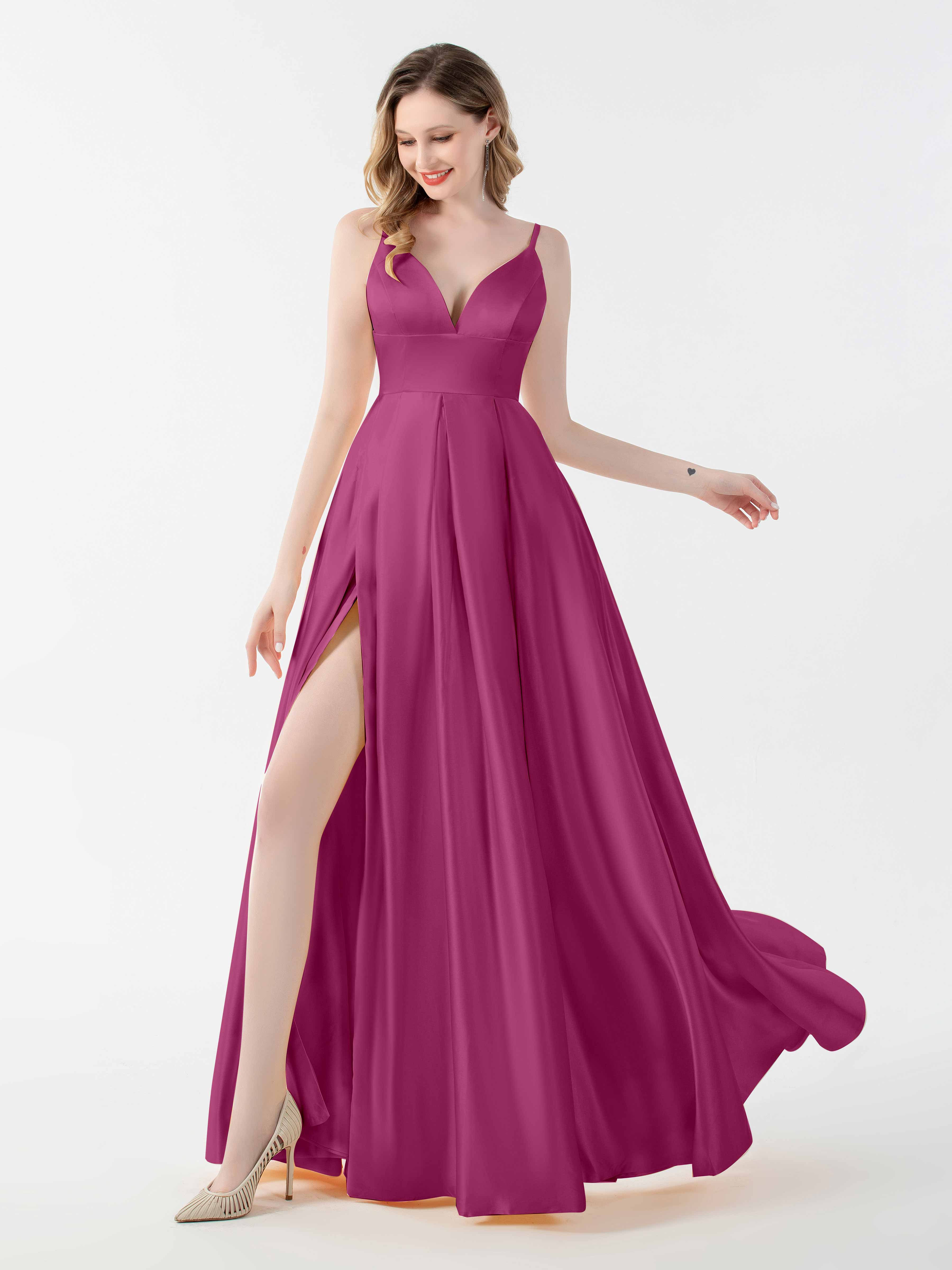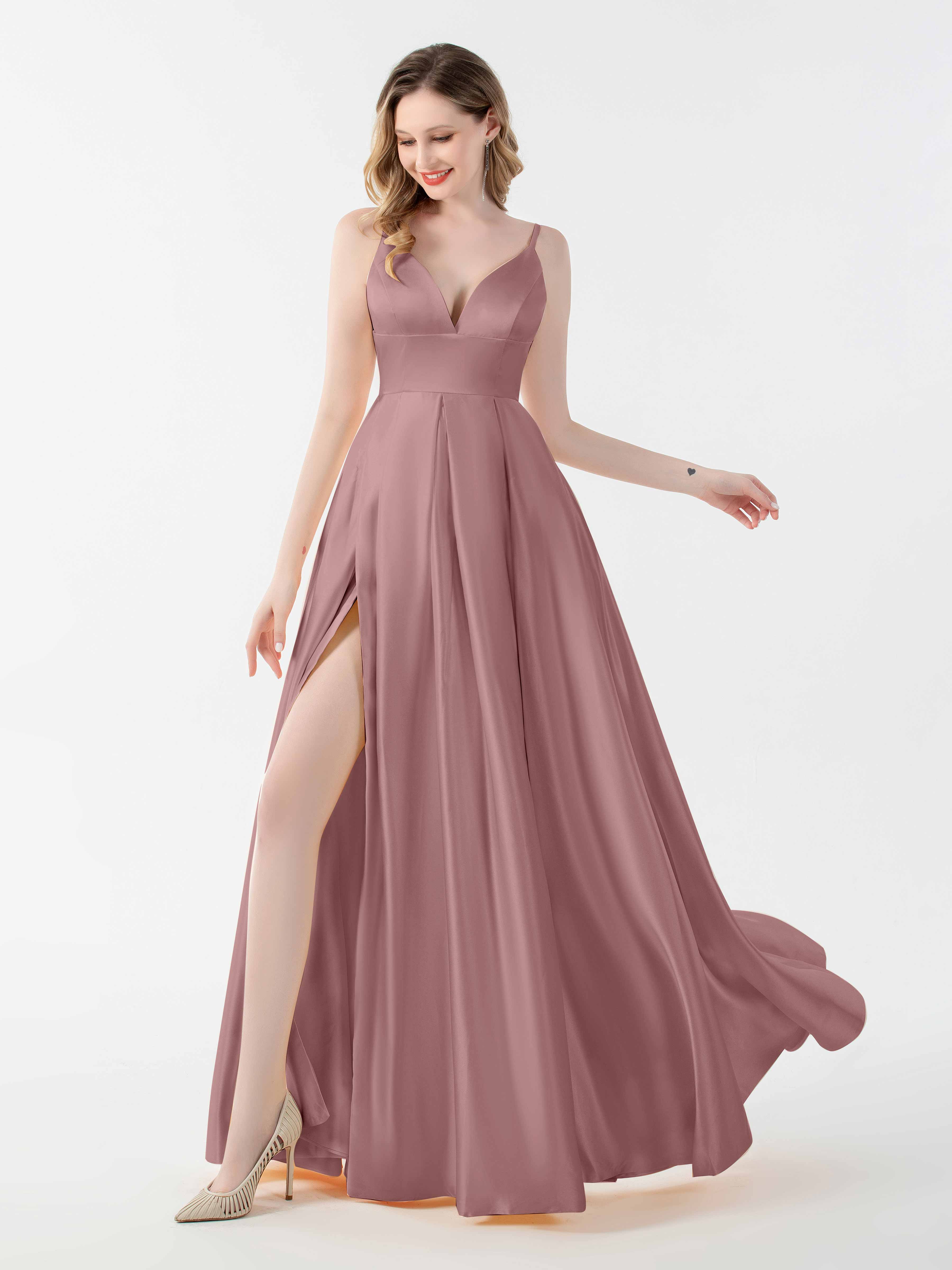 Robes En Satin À Fente À Jambe Et Col V Avec Poches Noelle