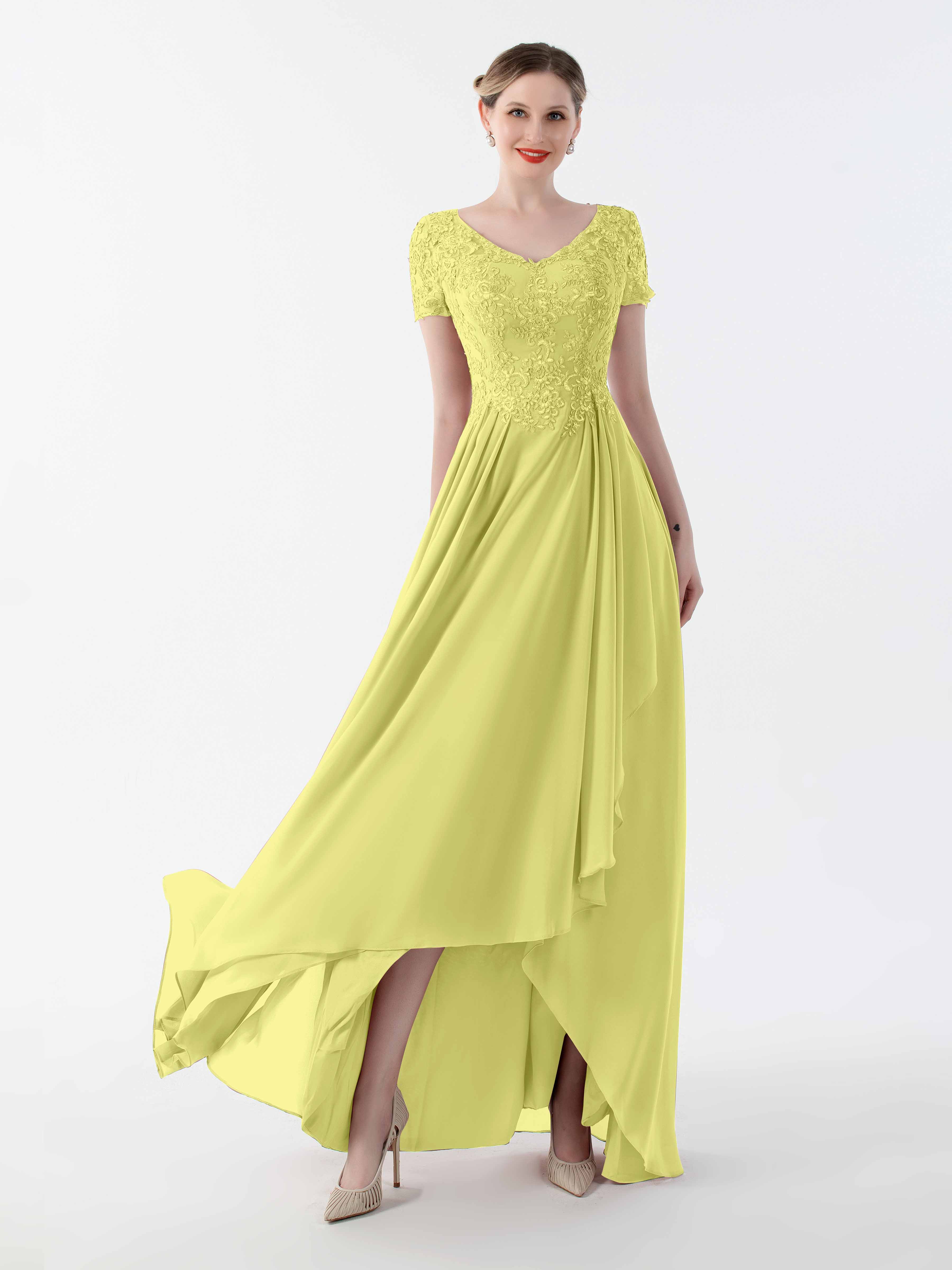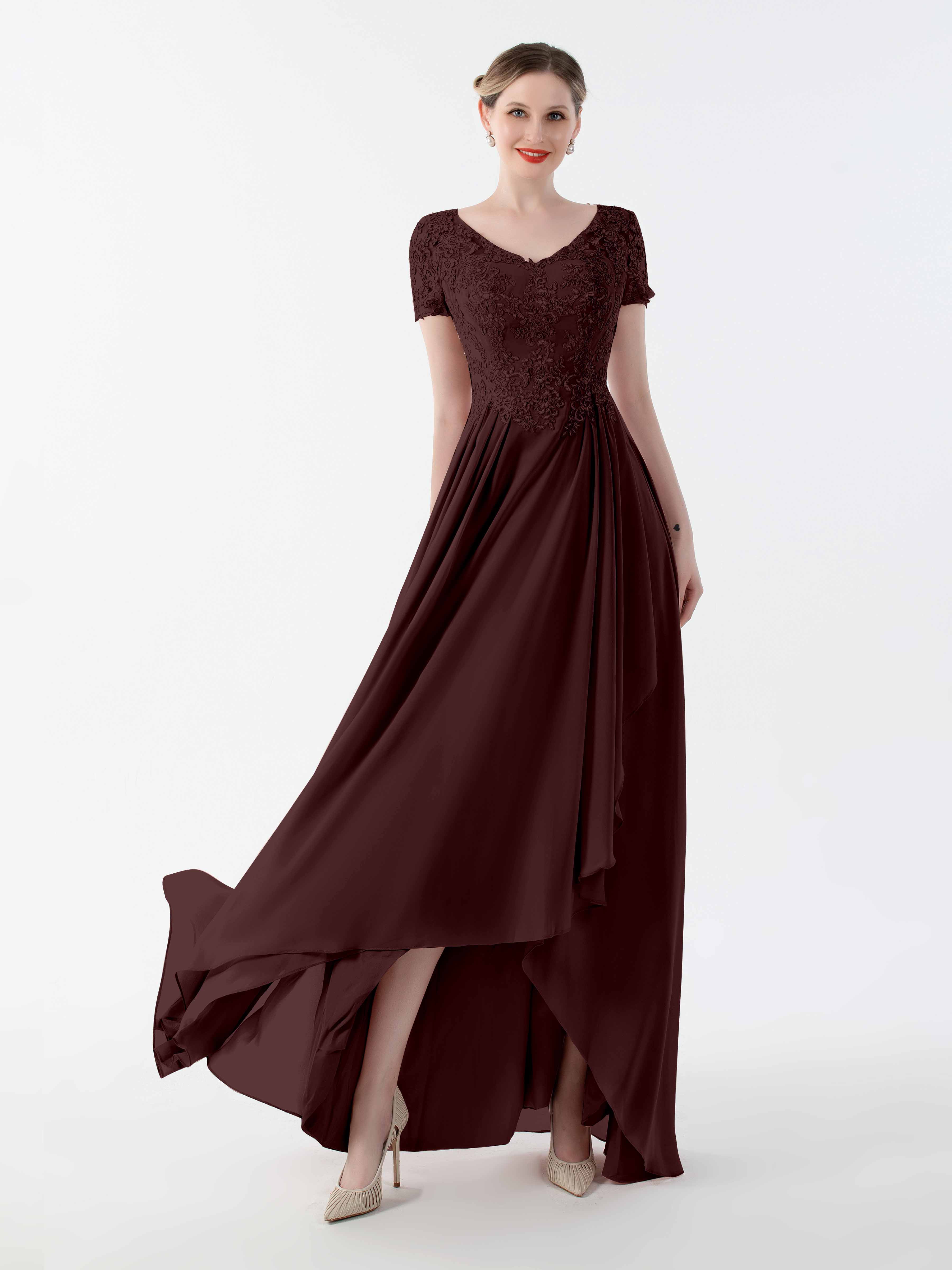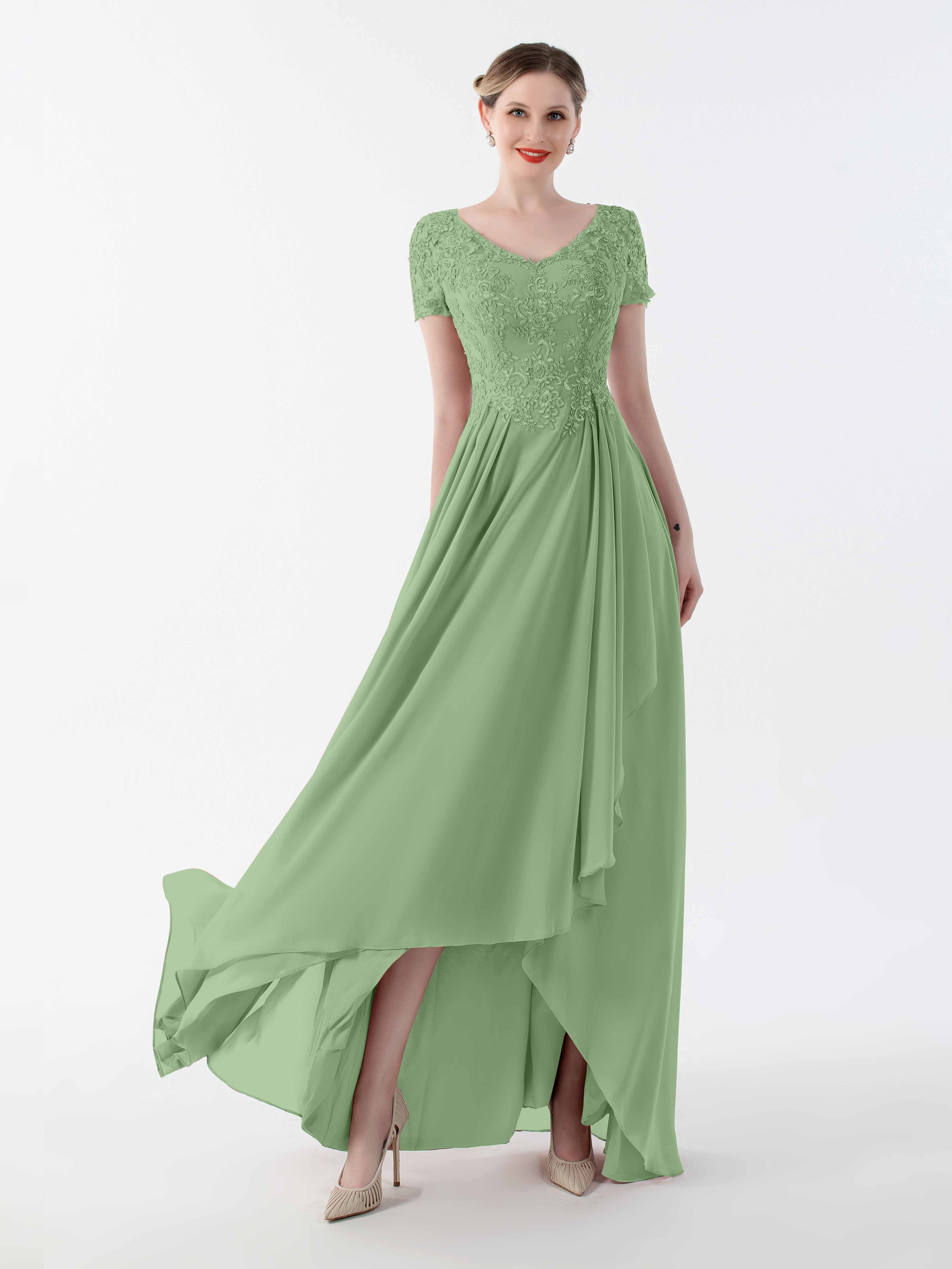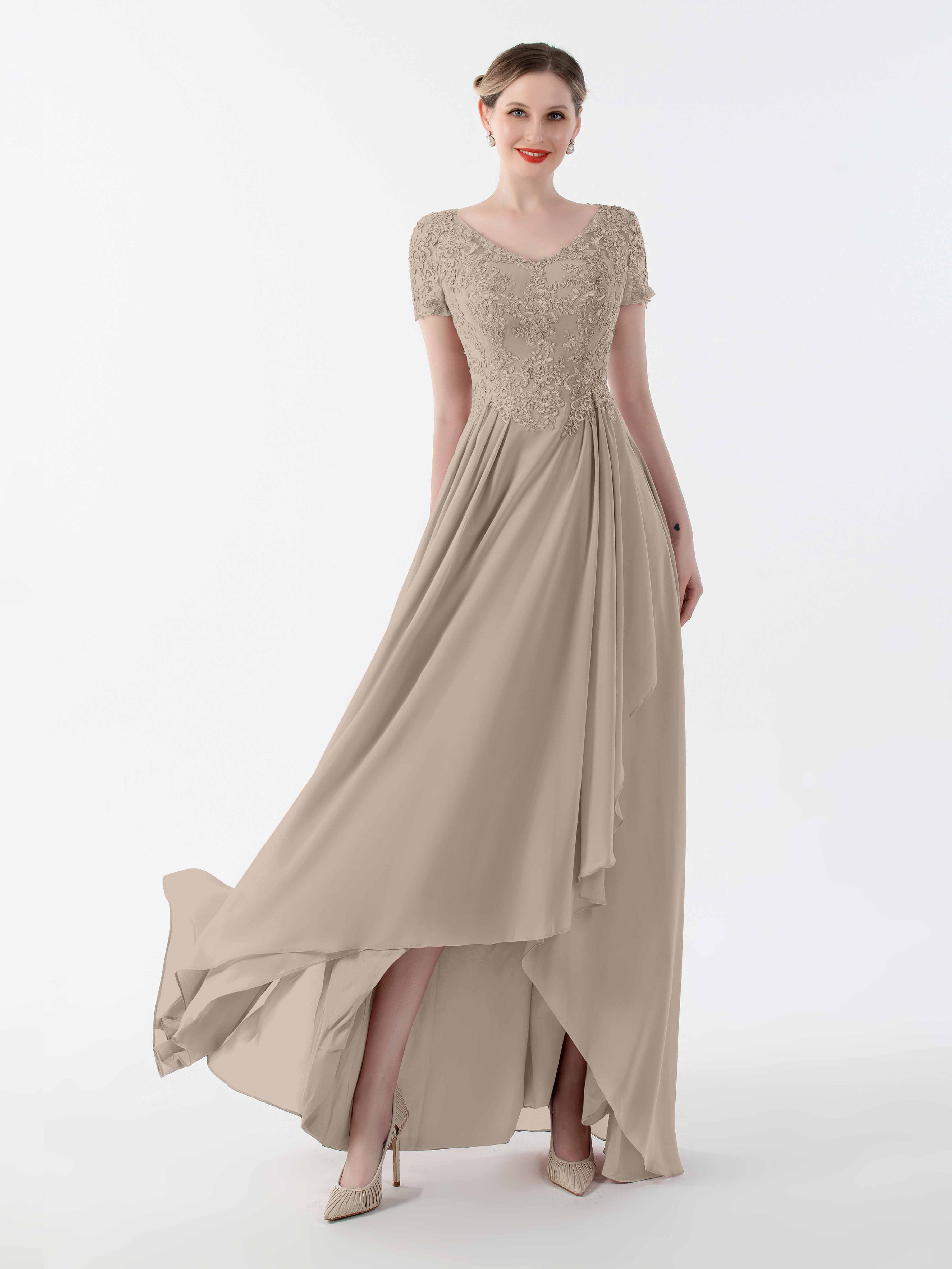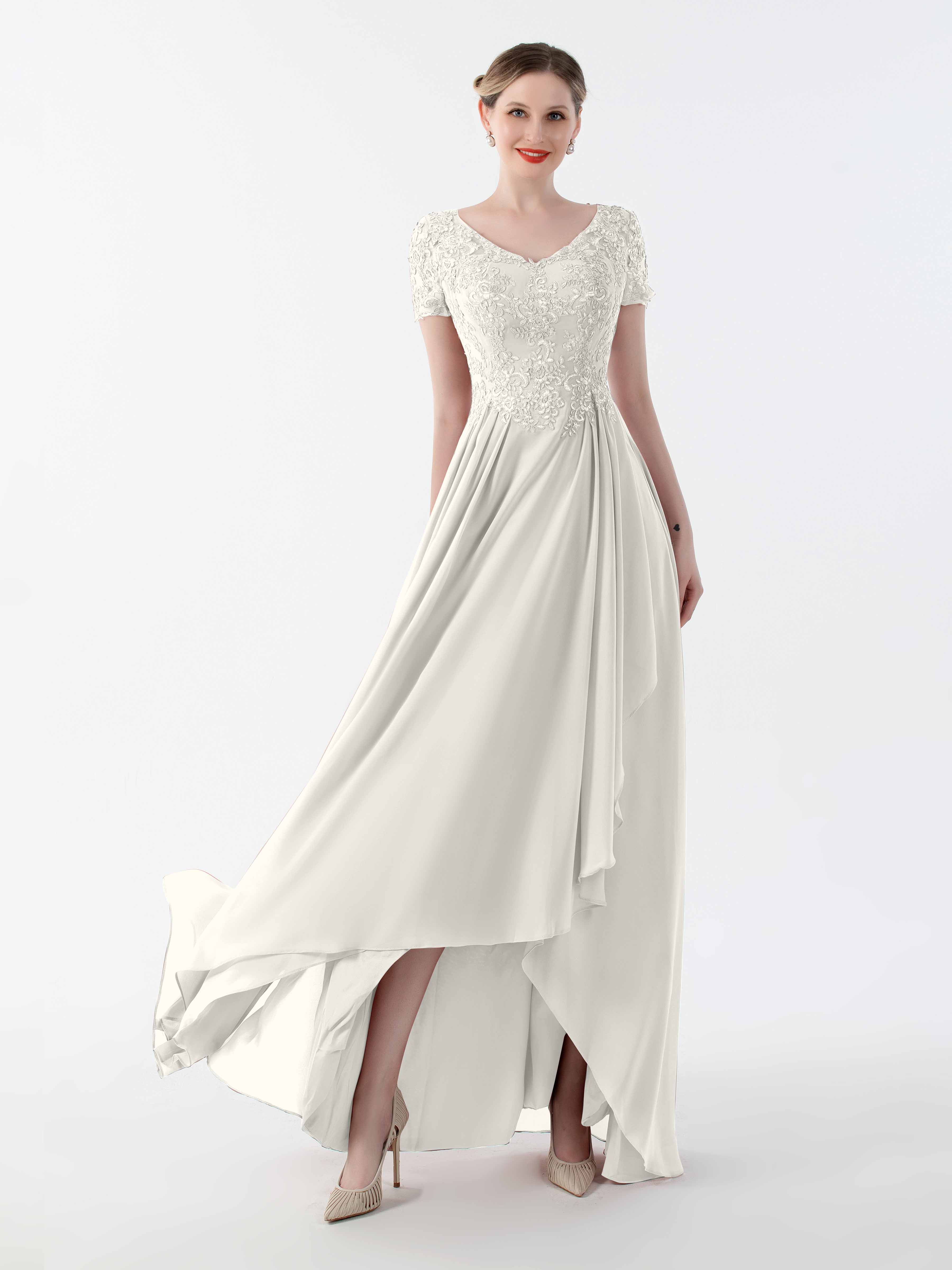 Adoptez le charme et l'élégance avec les robes de mère de mariée de Pomuyoo.fr. Ces robes présentent de charmantes manches courtes et un ourlet haut-bas, ajoutant une touche unique à votre look. Confectionnés à partir de mousseline délicate et de dentelle, ils offrent à la fois style et sophistication.